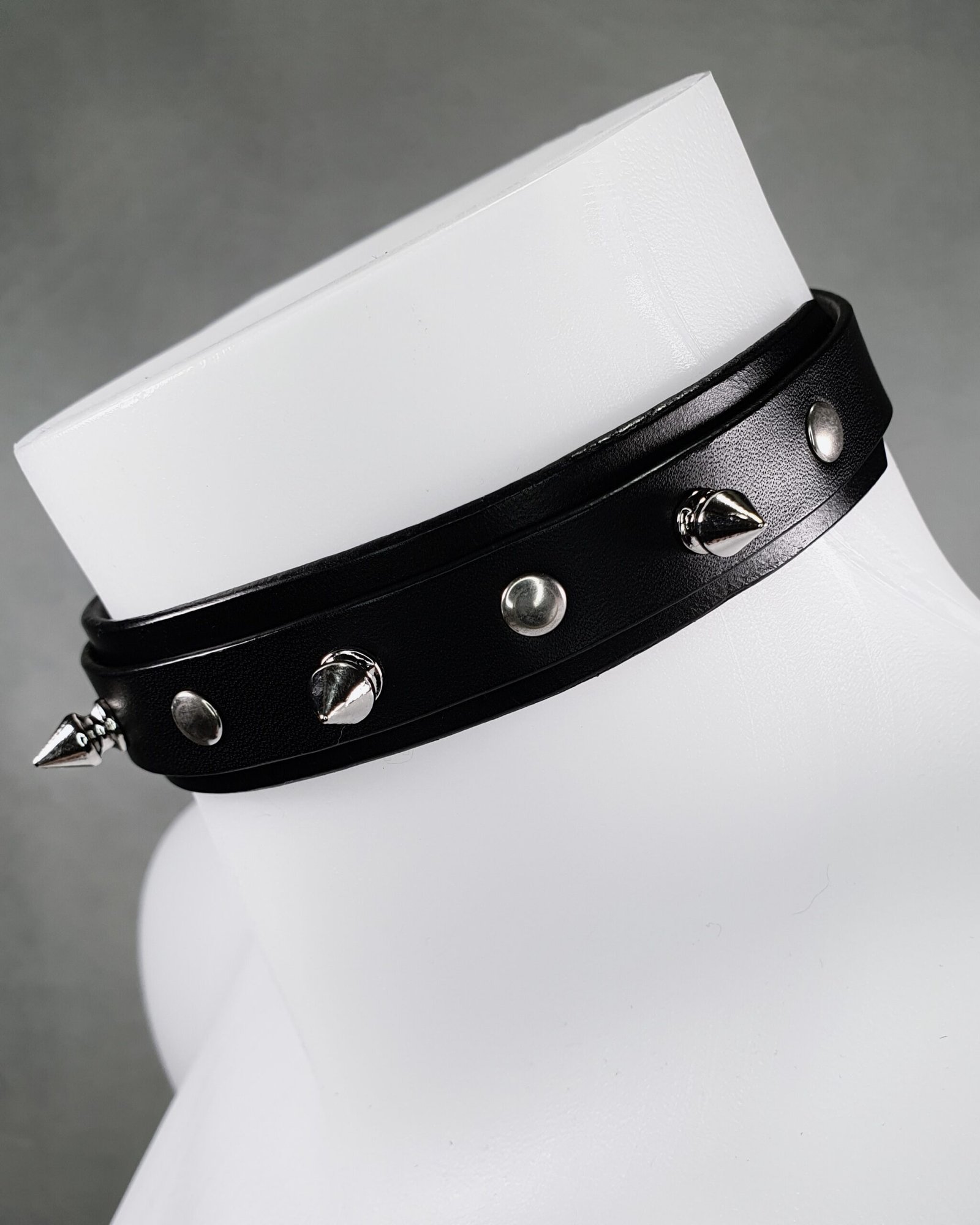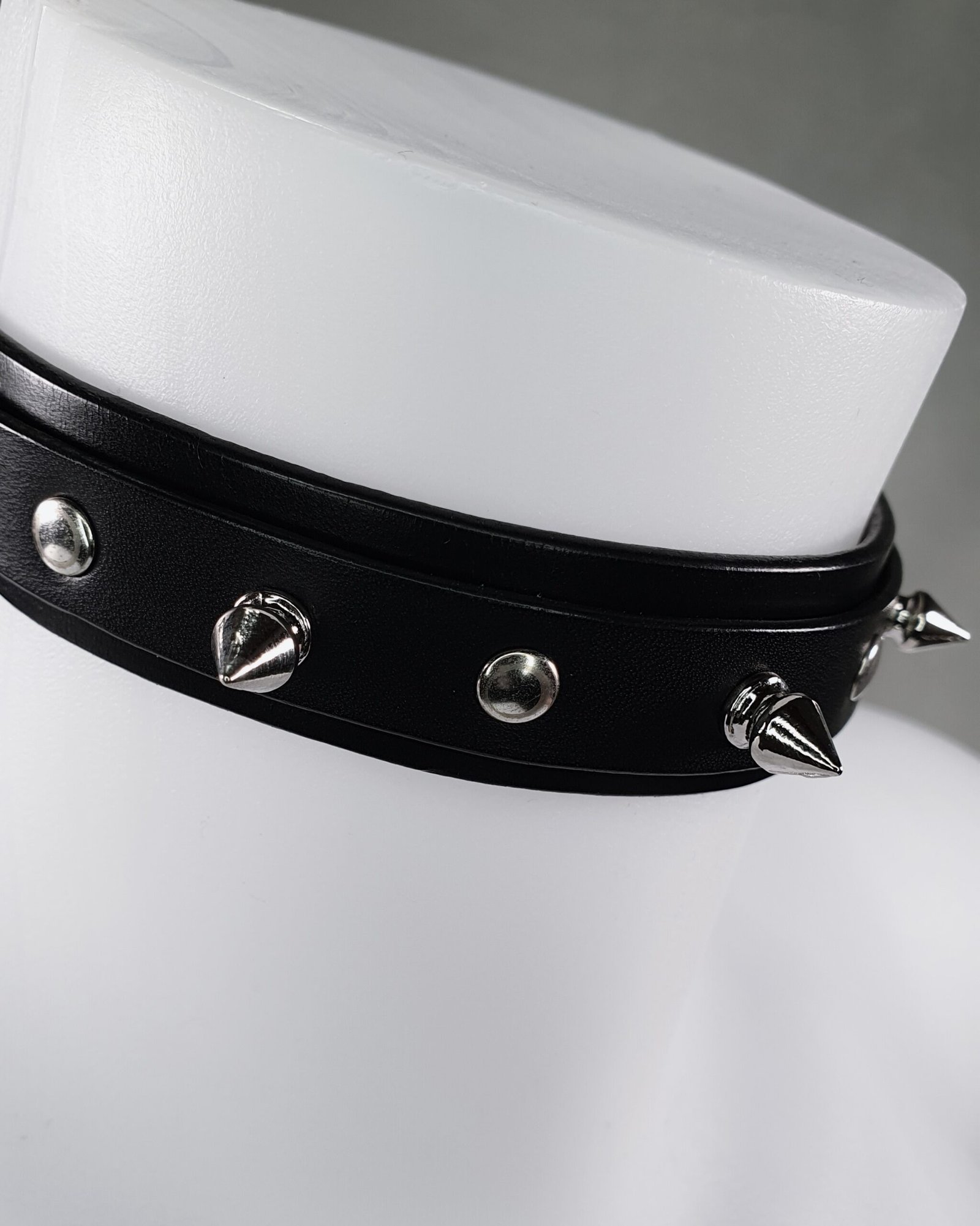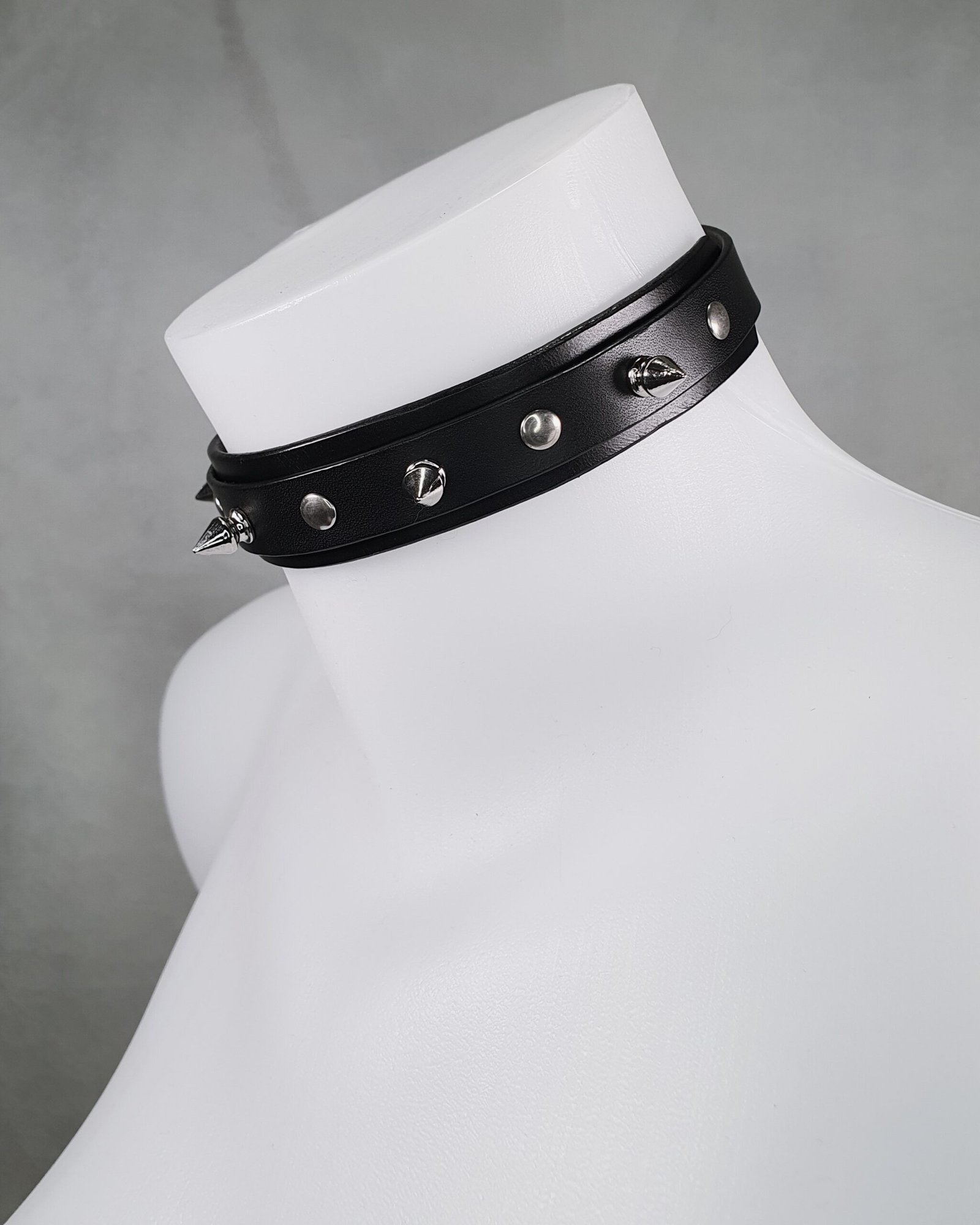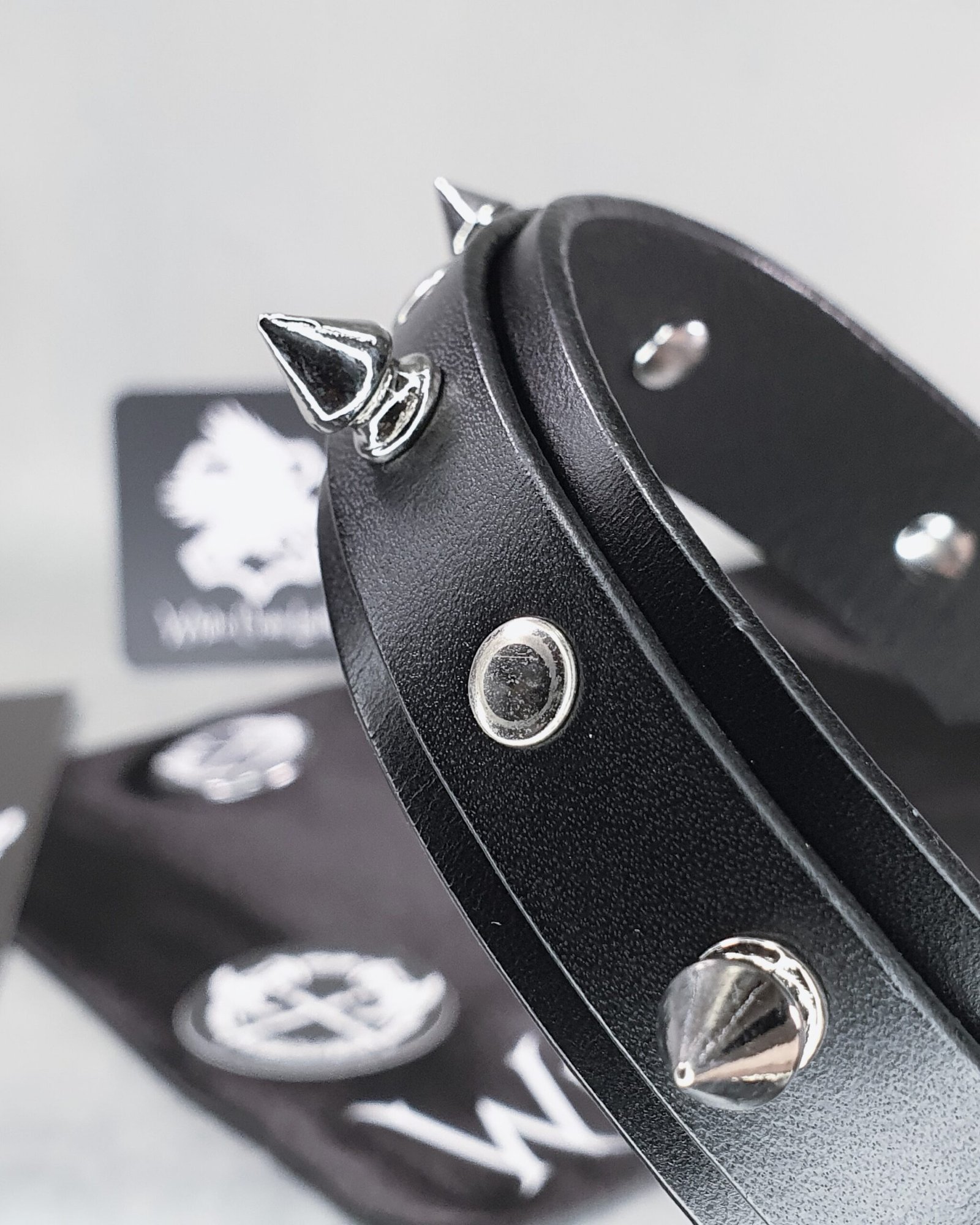 This double-layered choker is embellished with silvery rivets and five 11mm spikes, creating an accessory that combines comfort with an aggressive style. The look of genuine black leather is complemented by steel details for a raw aesthetic.