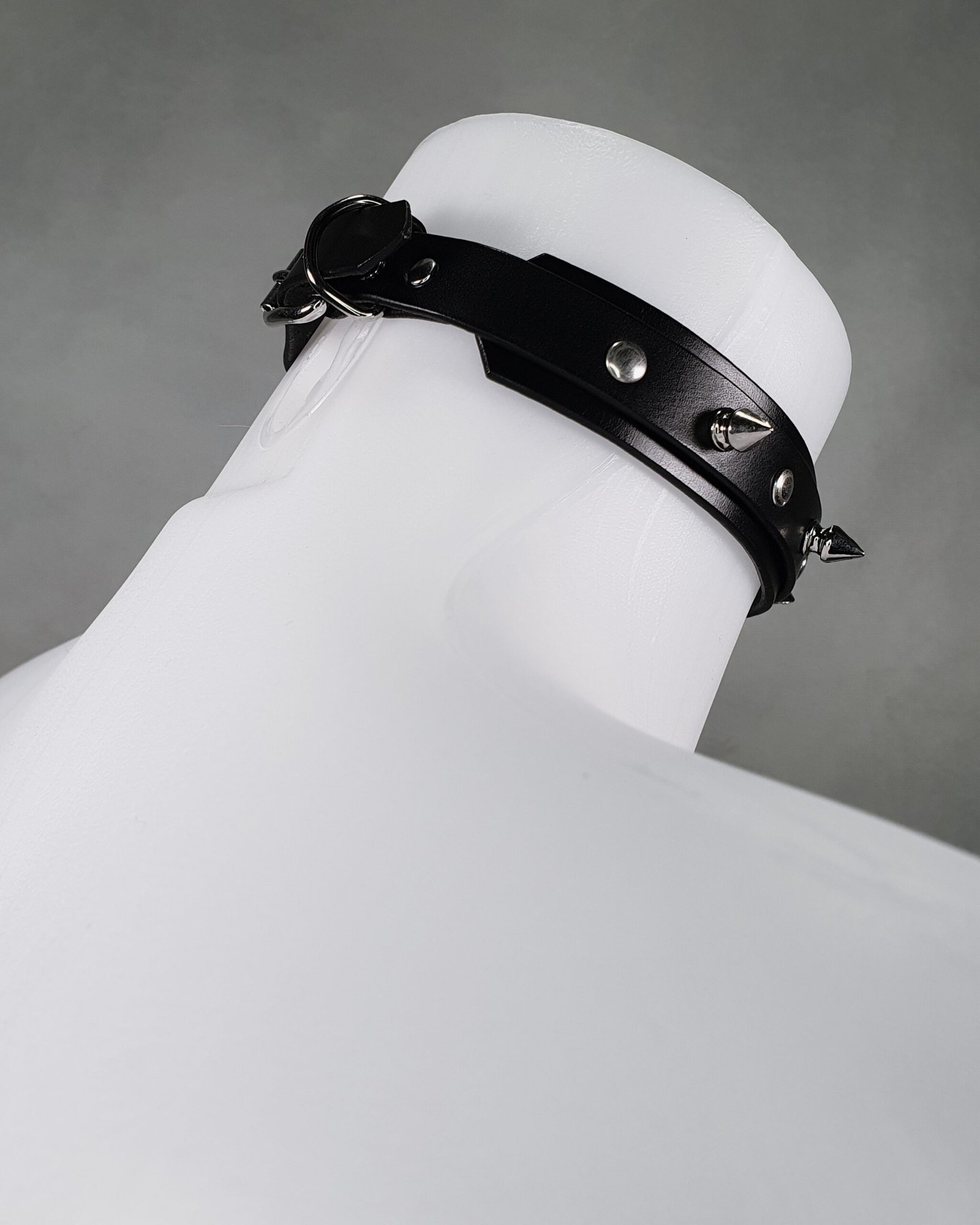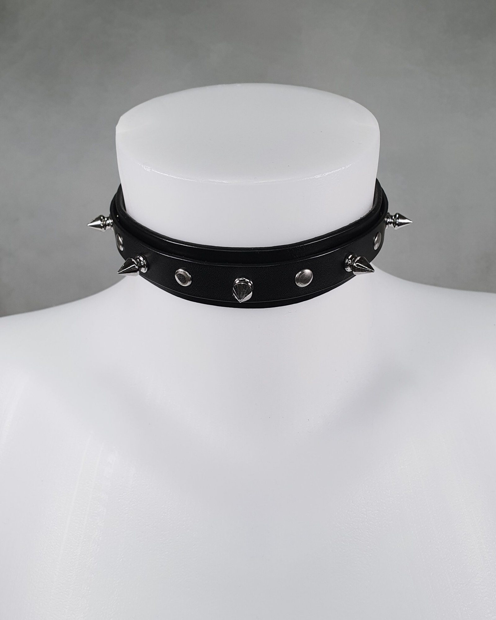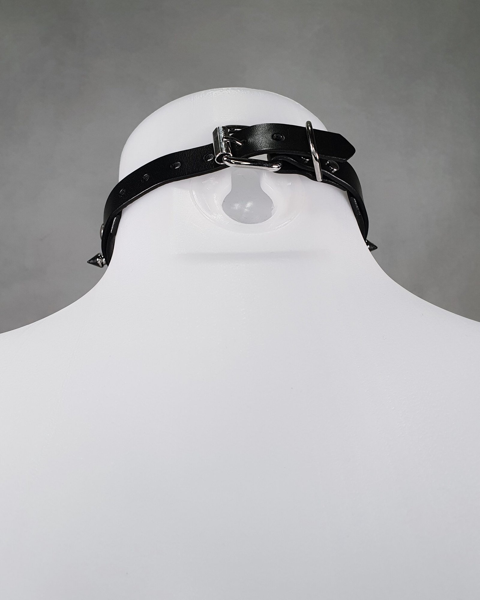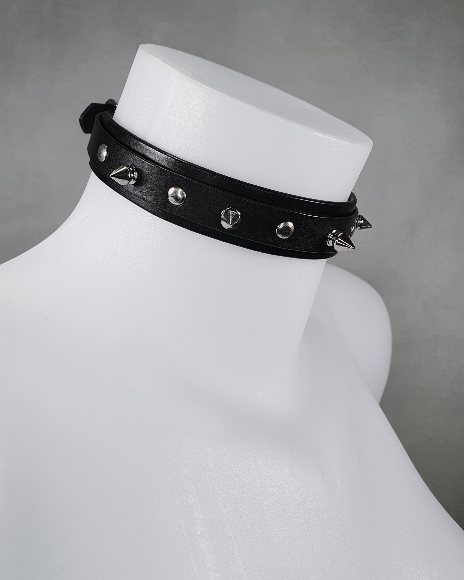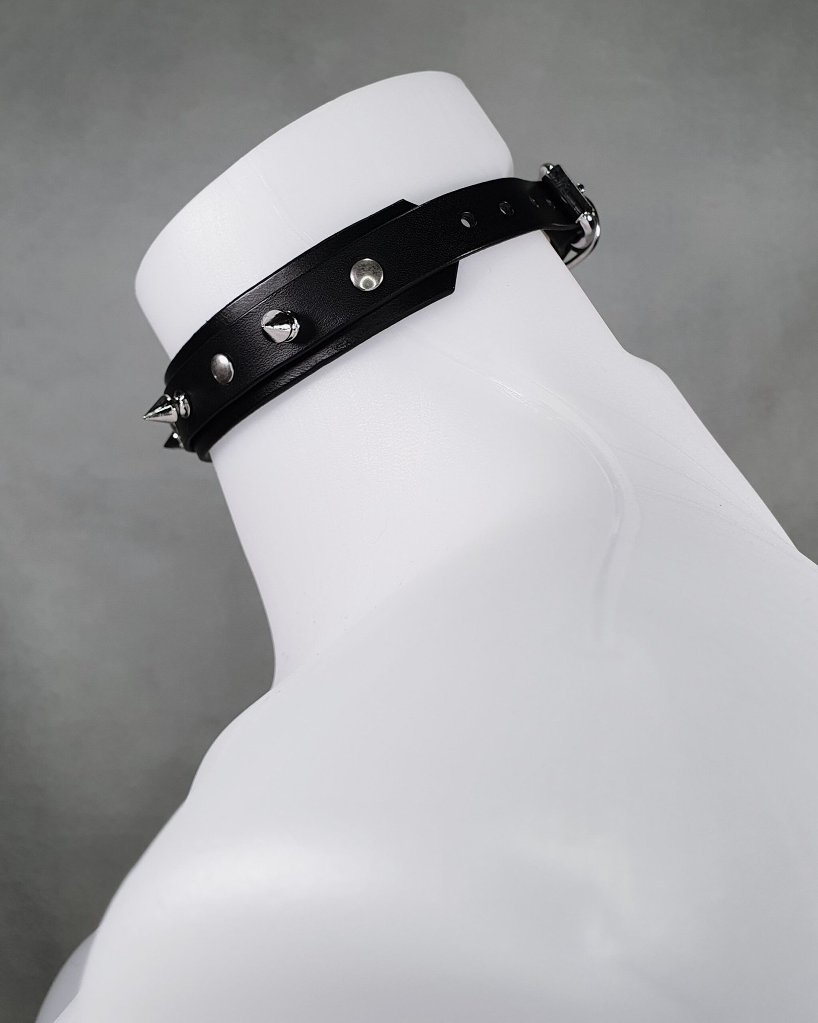 This double-layered choker is embellished with silvery rivets and five 11mm spikes, creating an accessory that combines comfort with an aggressive style. The look of genuine black leather is complemented by steel details for a raw aesthetic.