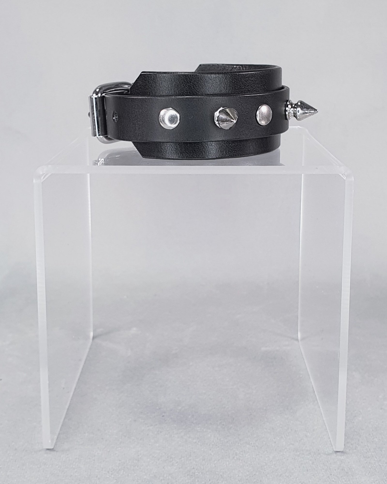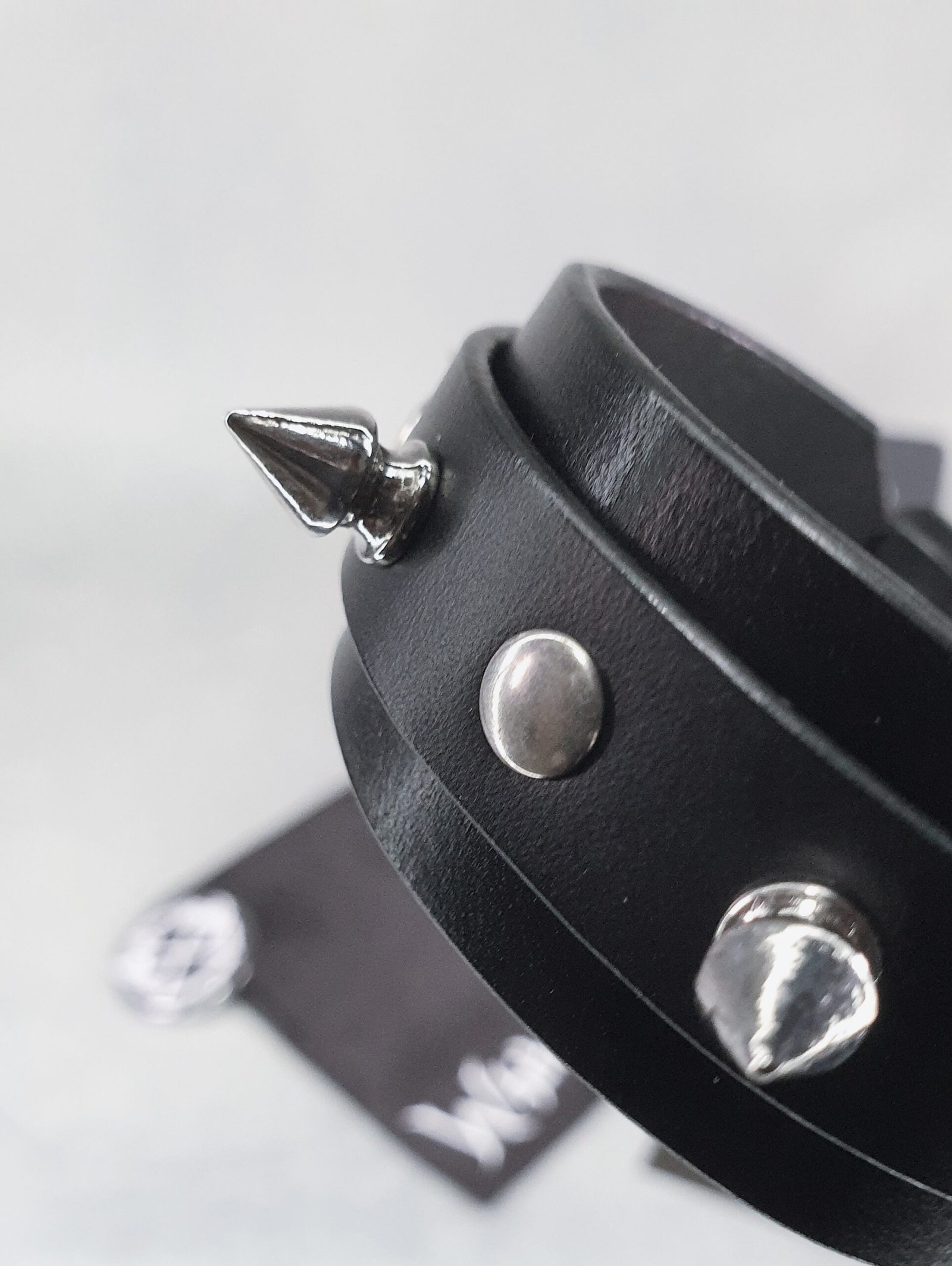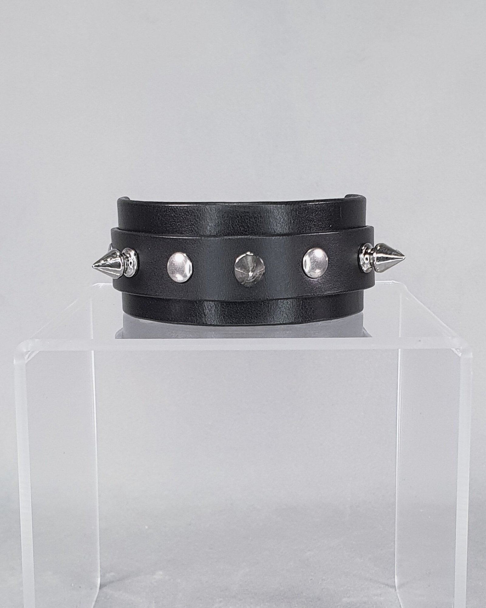 The black leather of this double-layered wristband is embellished with rivets and three 11mm spikes for a brutalist and uncompromising style. A powerful accessory to wear with confidence on your everyday adventures.
