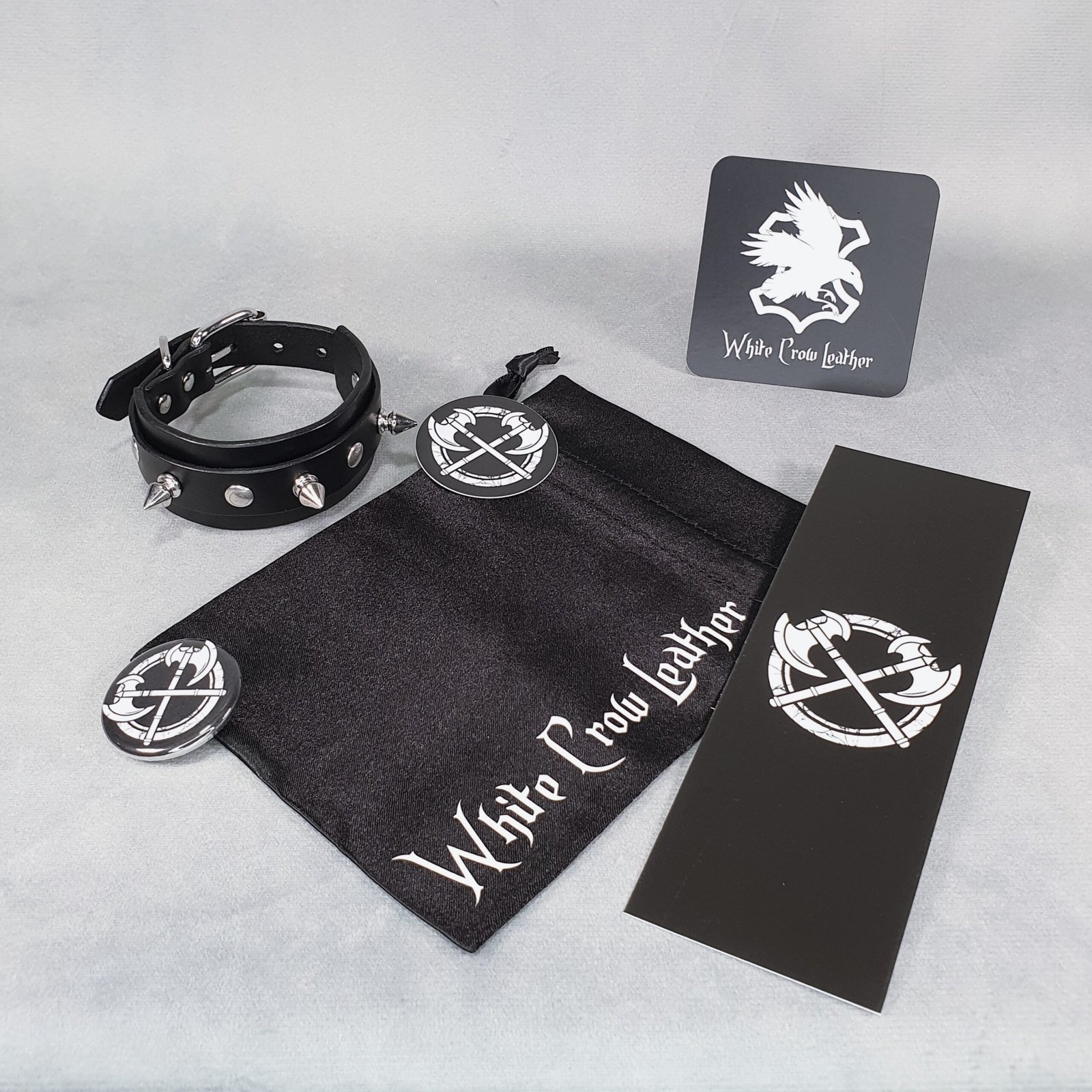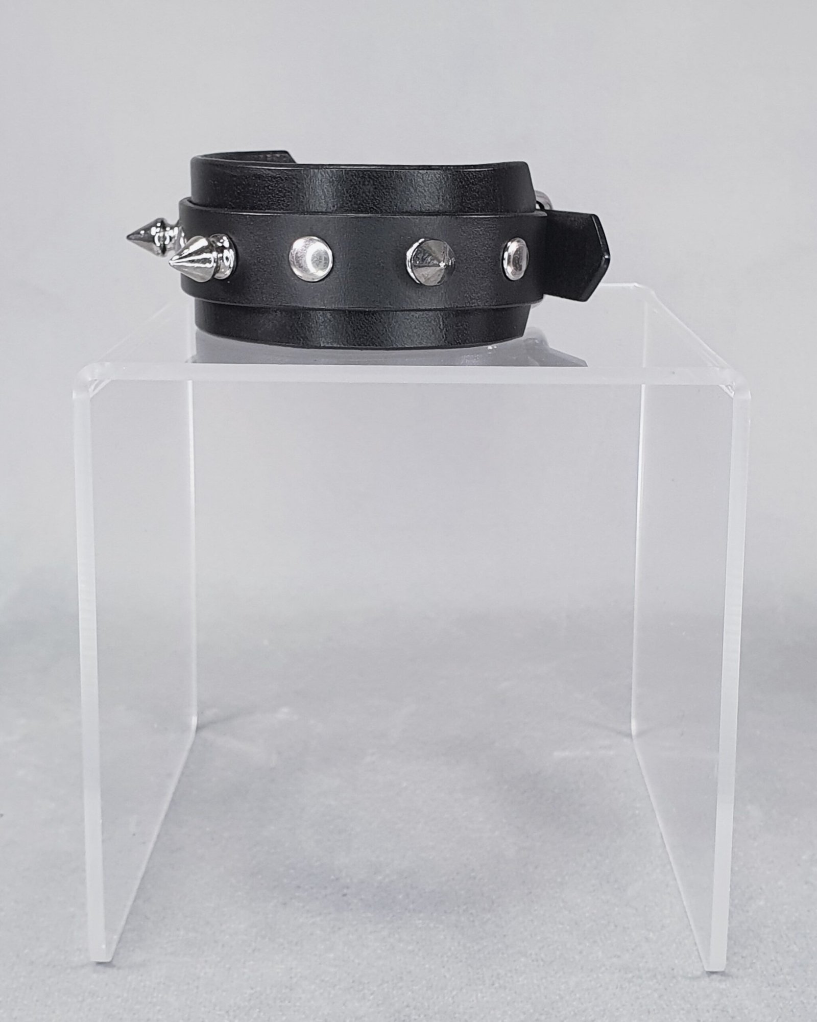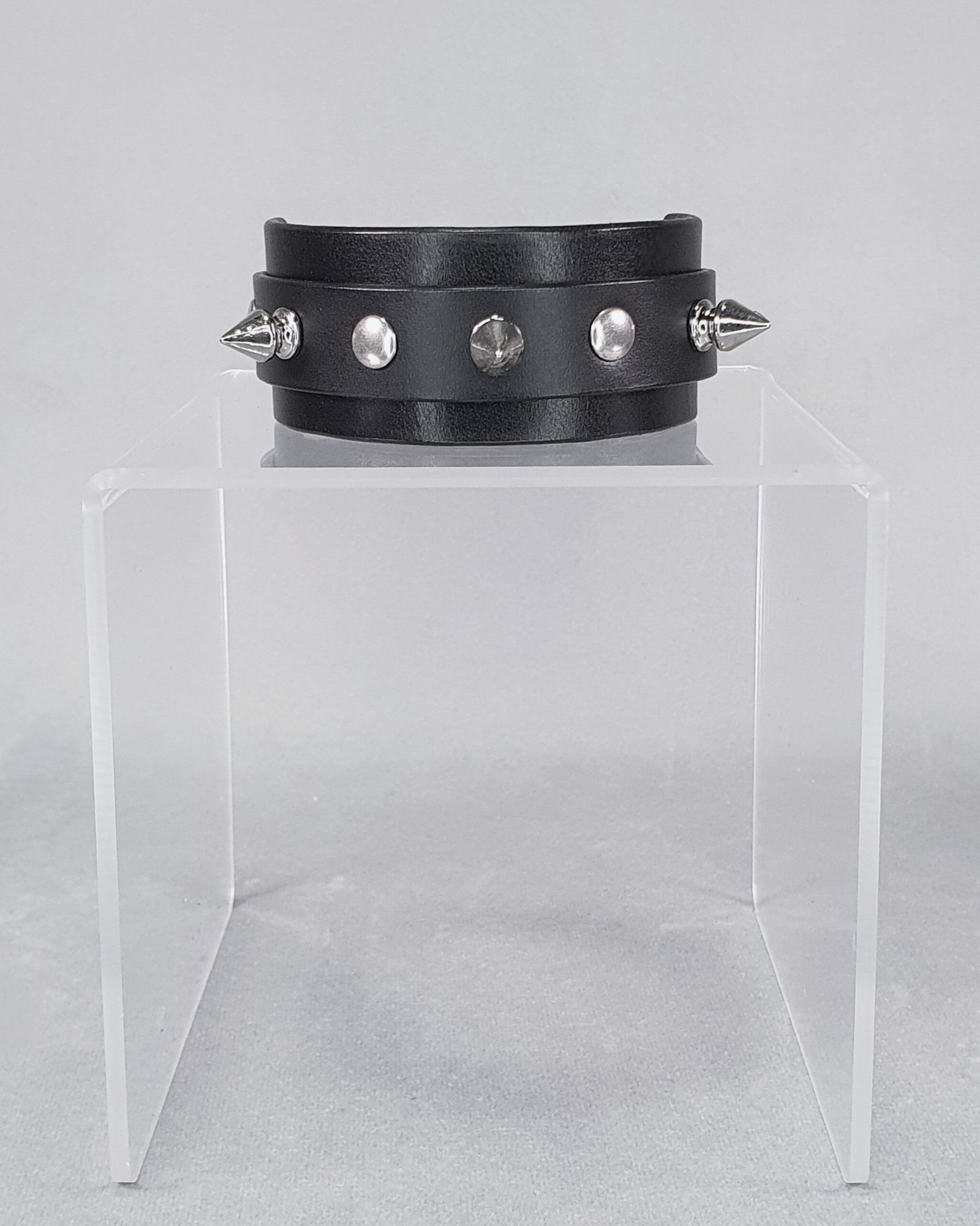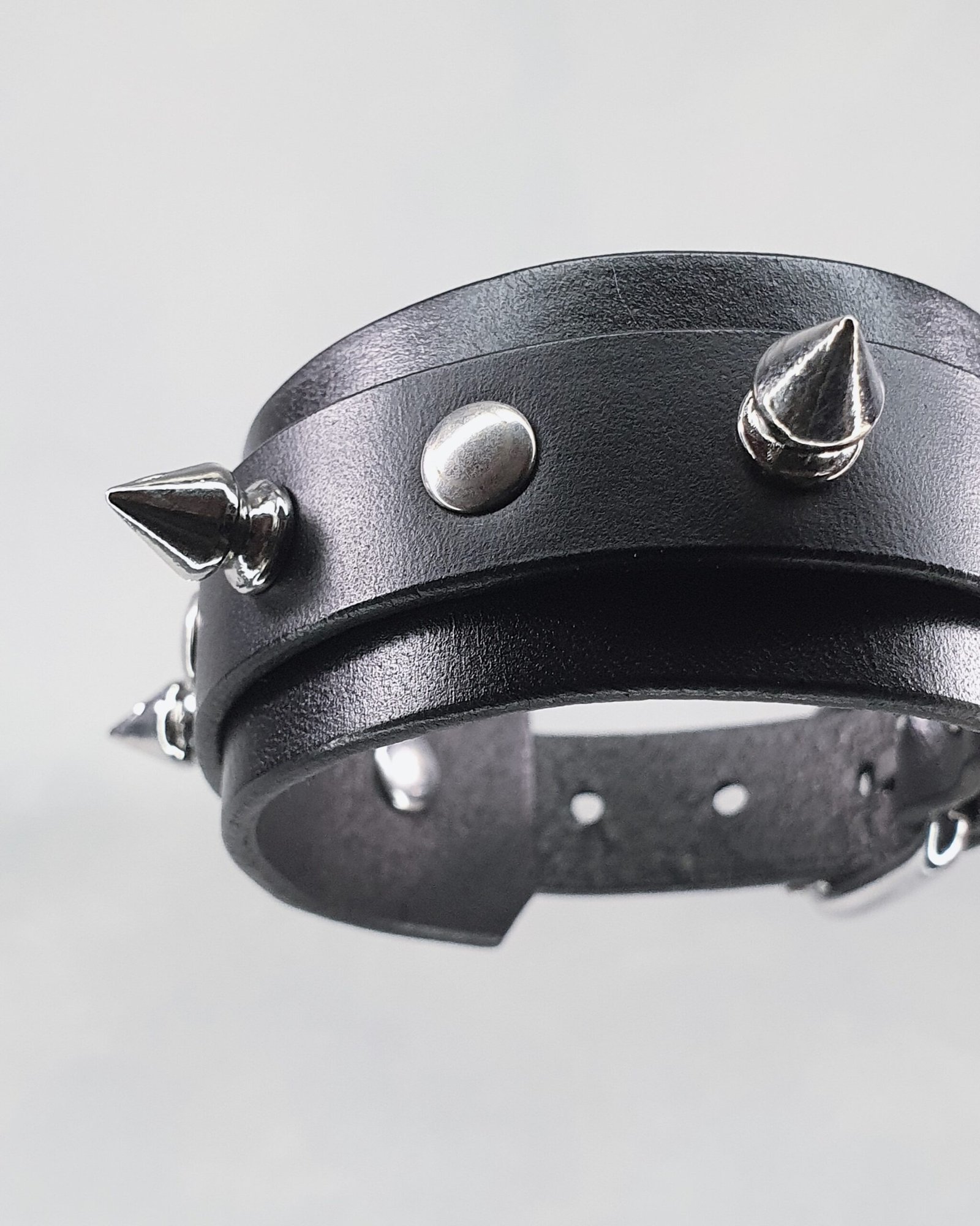 The black leather of this double-layered wristband is embellished with rivets and three 11mm spikes for a brutalist and uncompromising style. A powerful accessory to wear with confidence on your everyday adventures.
