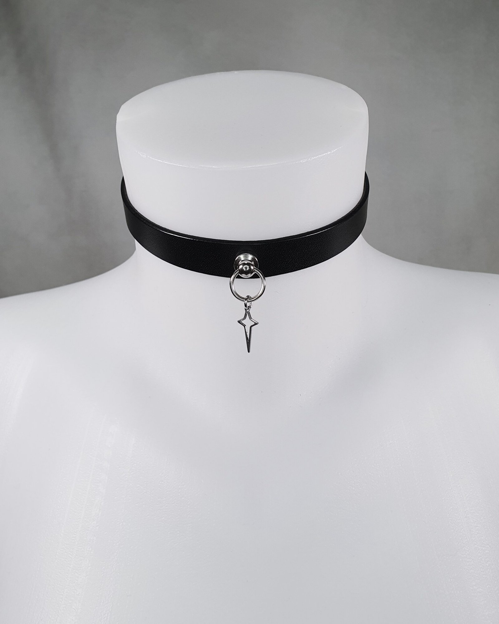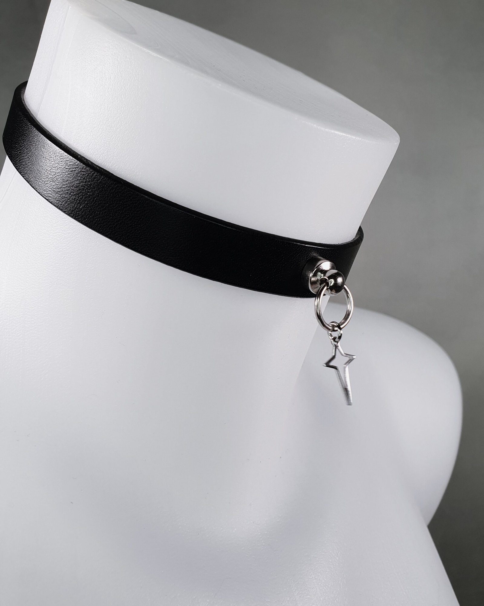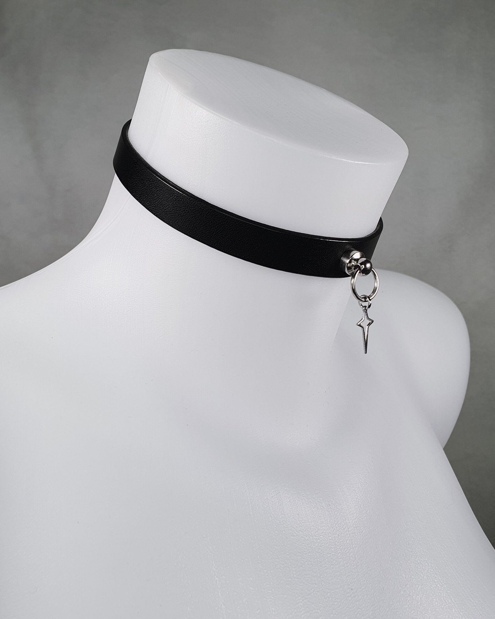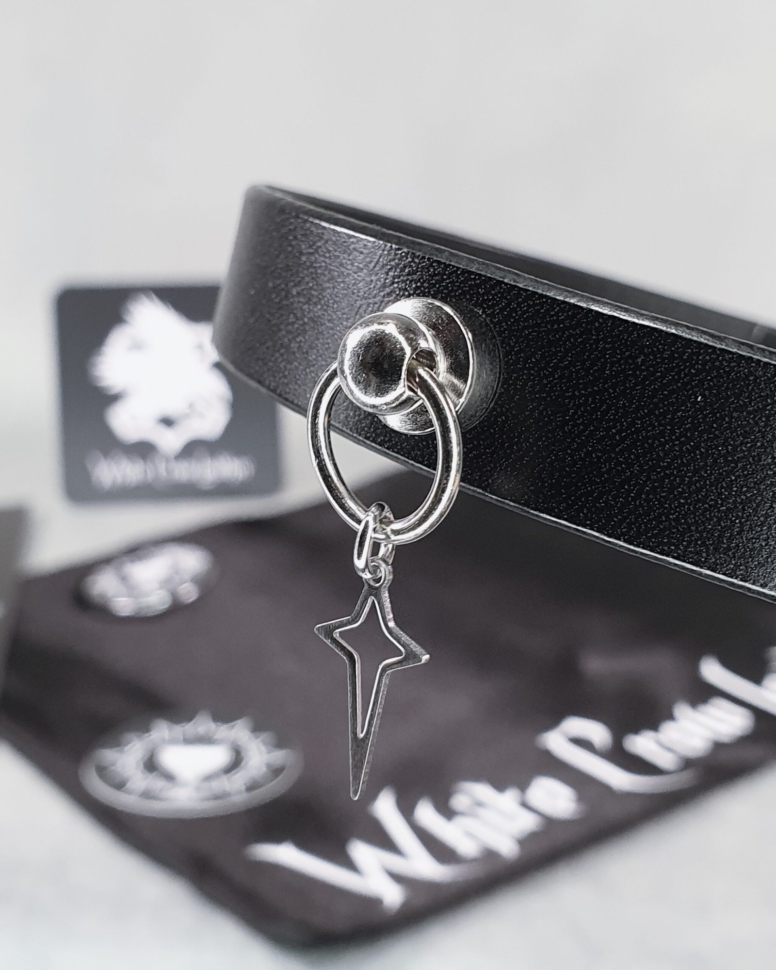 This elegant 15mm wide choker features a collar button and captive ring, embellished with a delicate four-pointed star. The raw look of the genuine black leather contrasts with silvery details to create a decidedly mystical style.