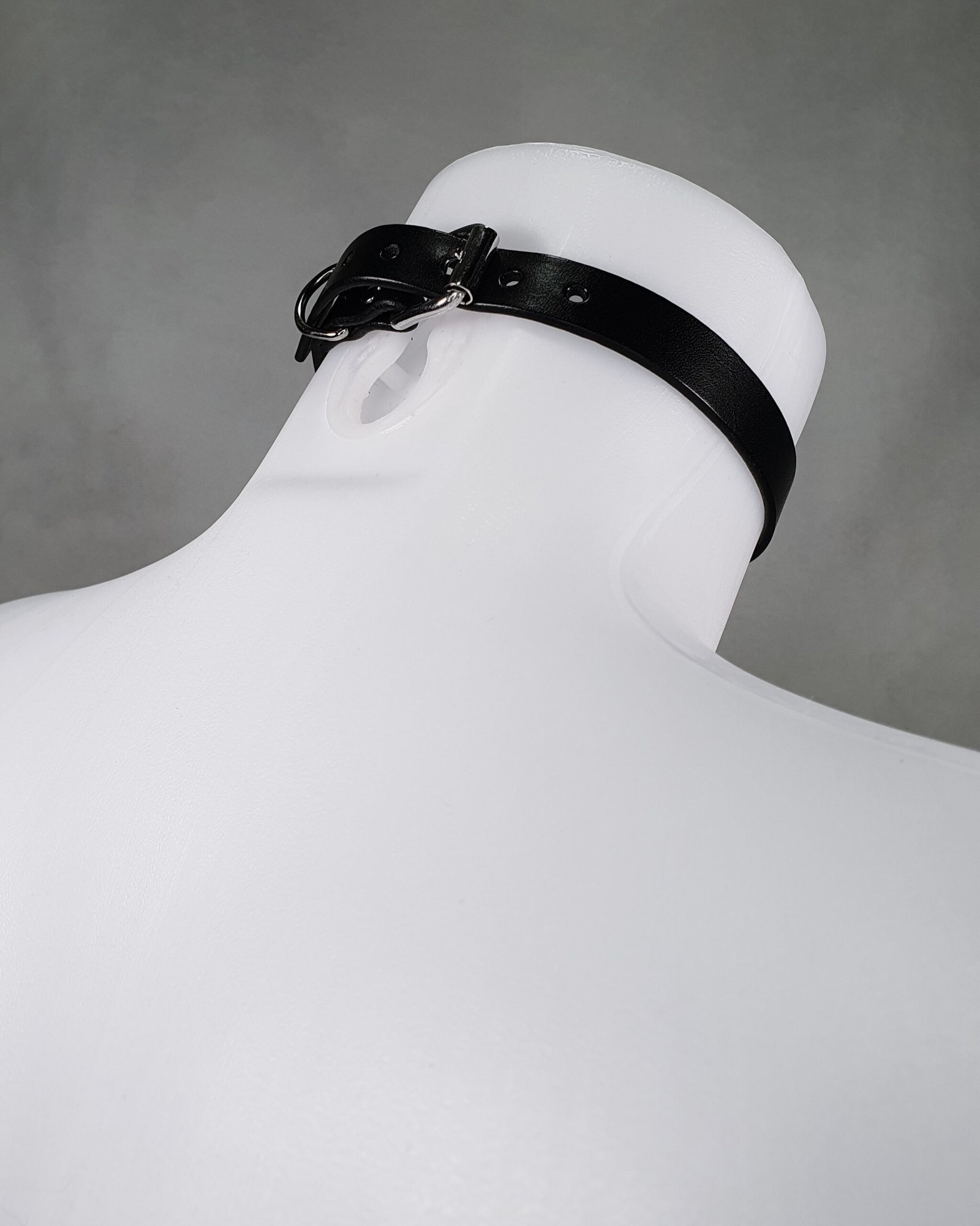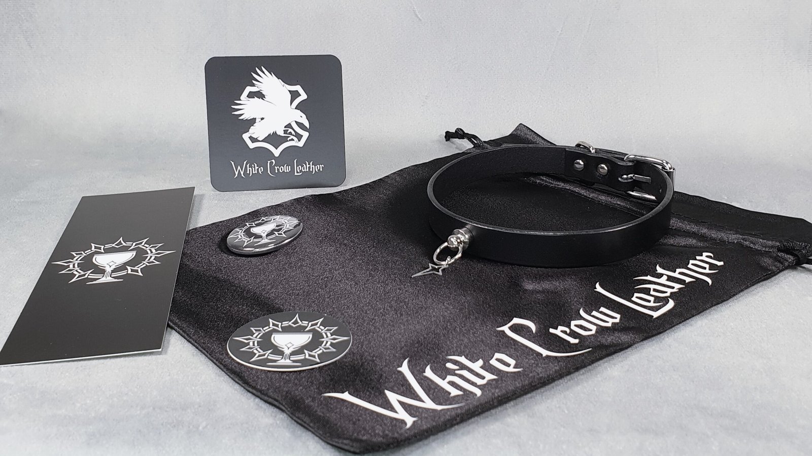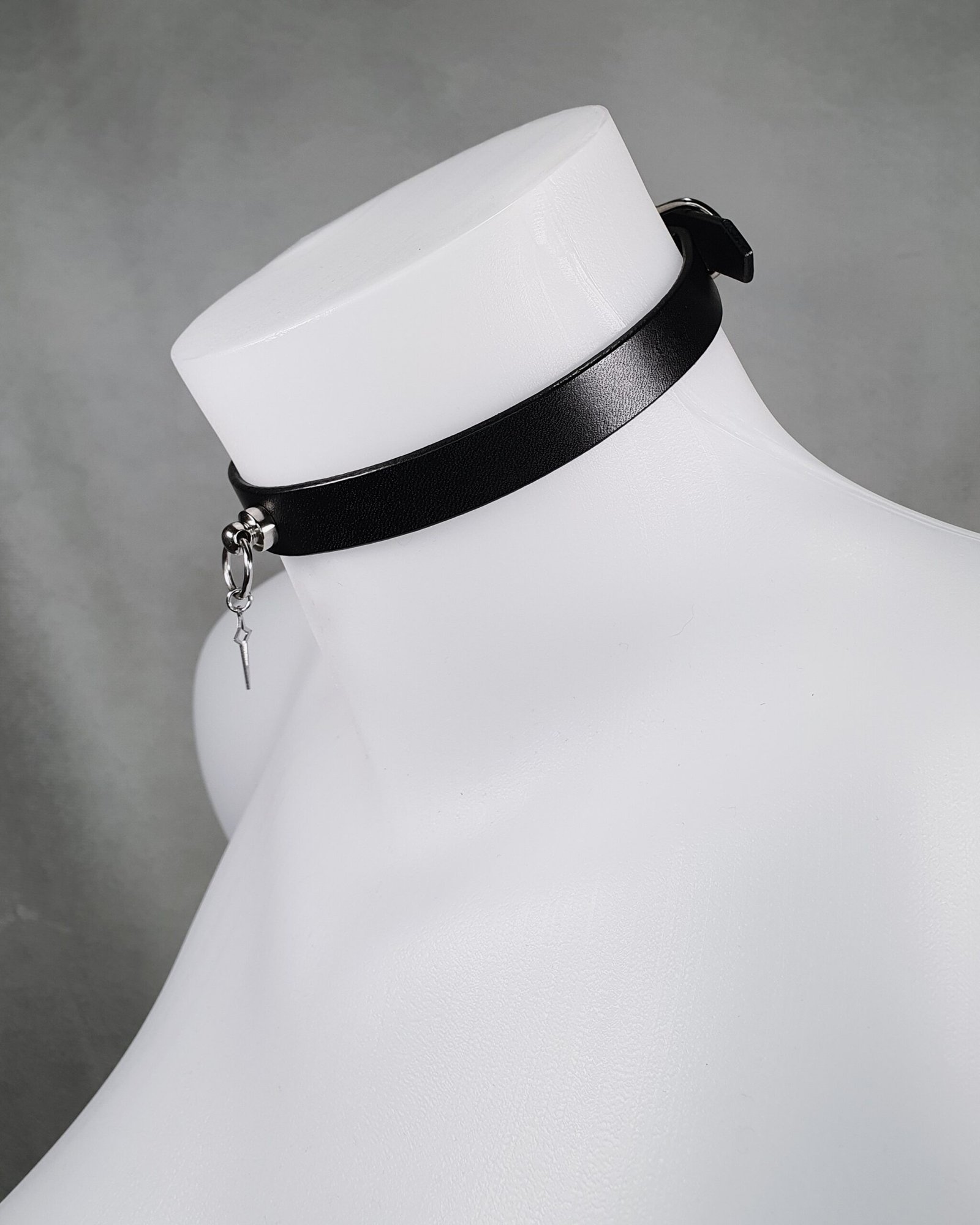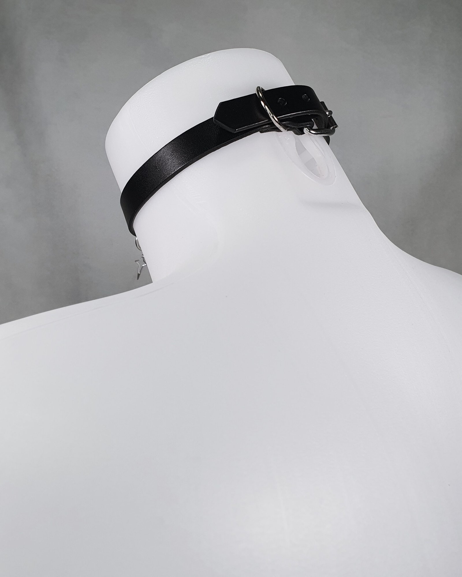 This elegant 15mm wide choker features a collar button and captive ring, embellished with a delicate four-pointed star. The raw look of the genuine black leather contrasts with silvery details to create a decidedly mystical style.