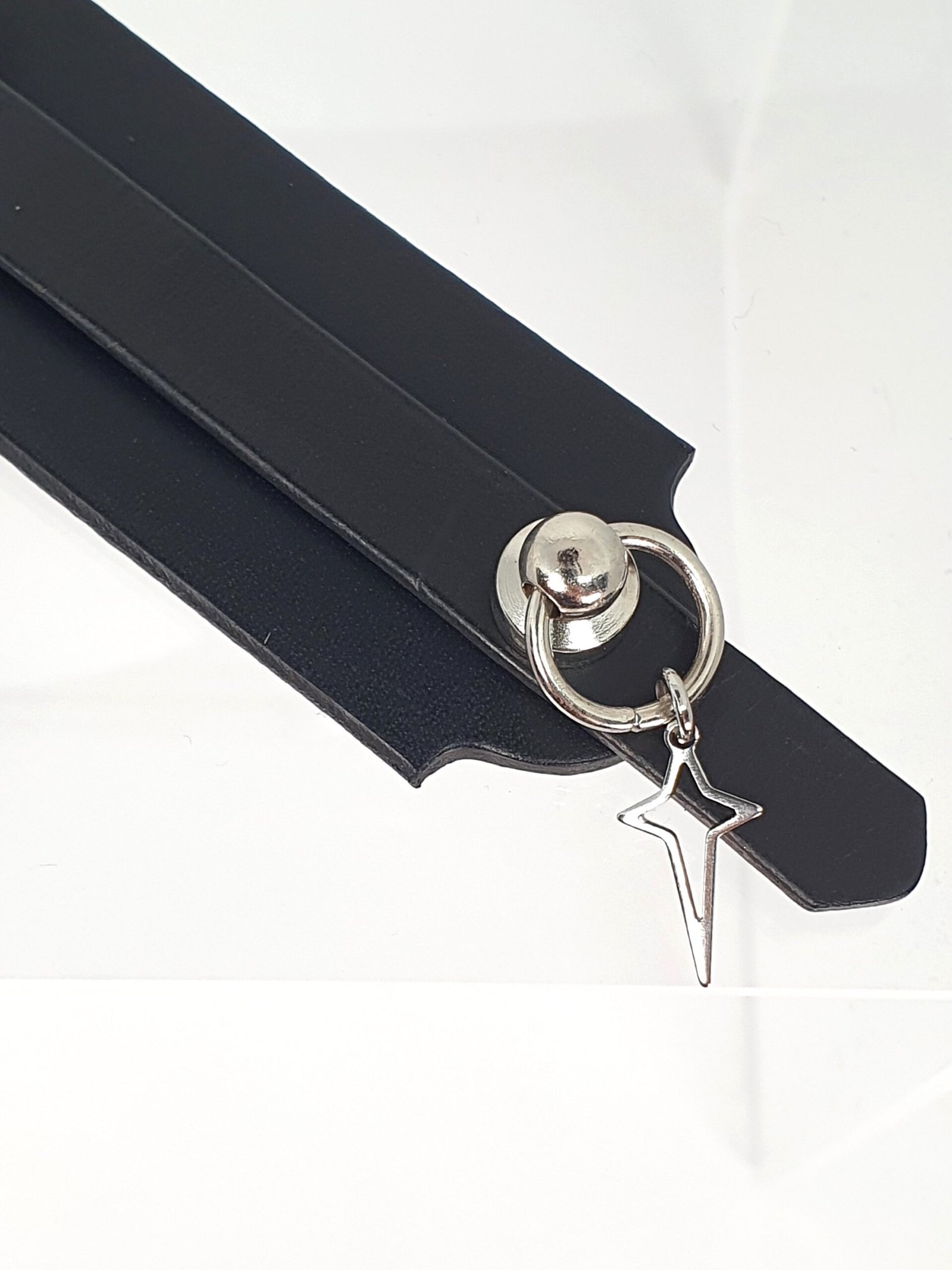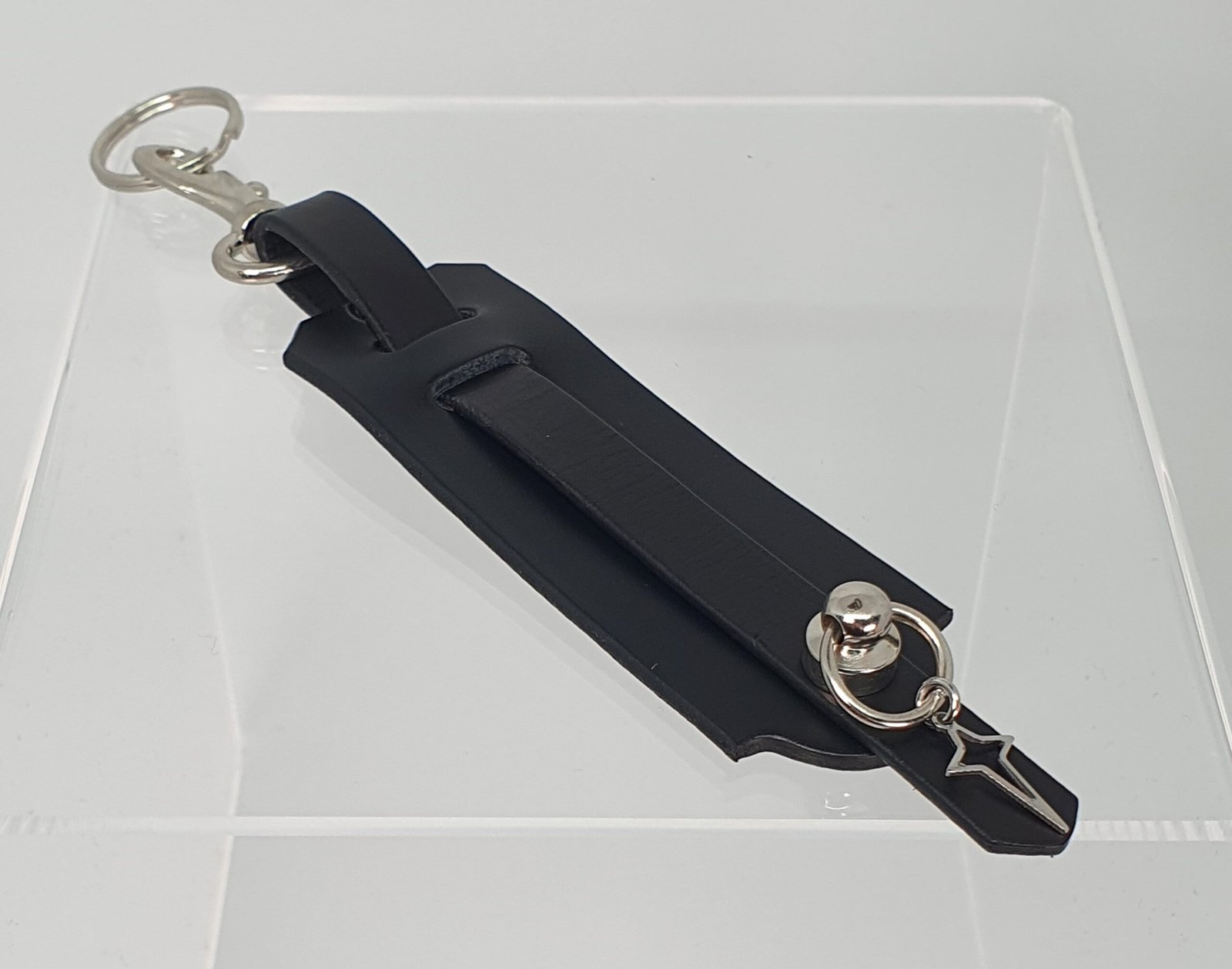 This genuine black leather keychain features a collar button with a captive ring and a four-pointed star charm. An accessory designed to express one's appreciation for celestial matters.