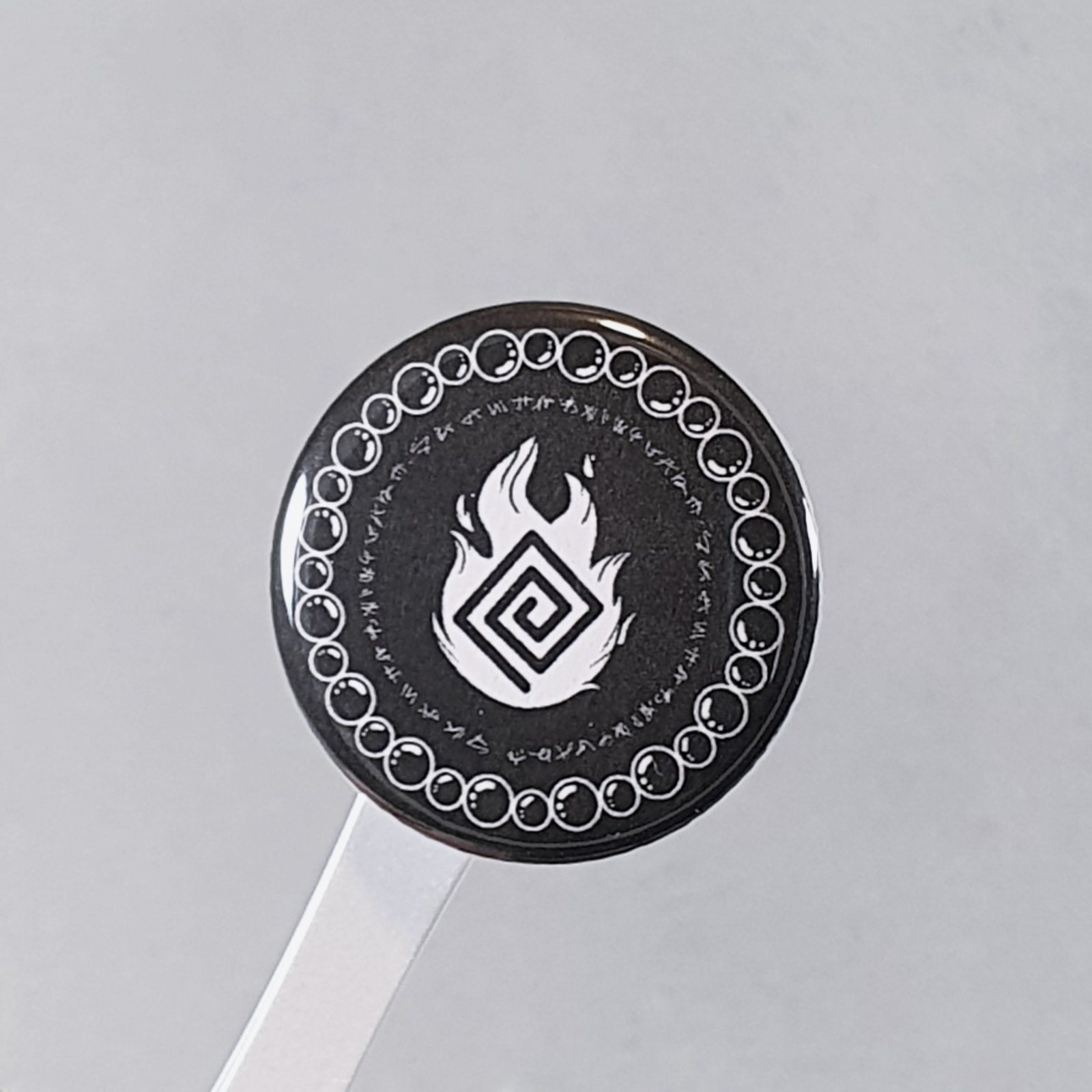 The symbol of the Brotherhood of Monks on a round pin badge.