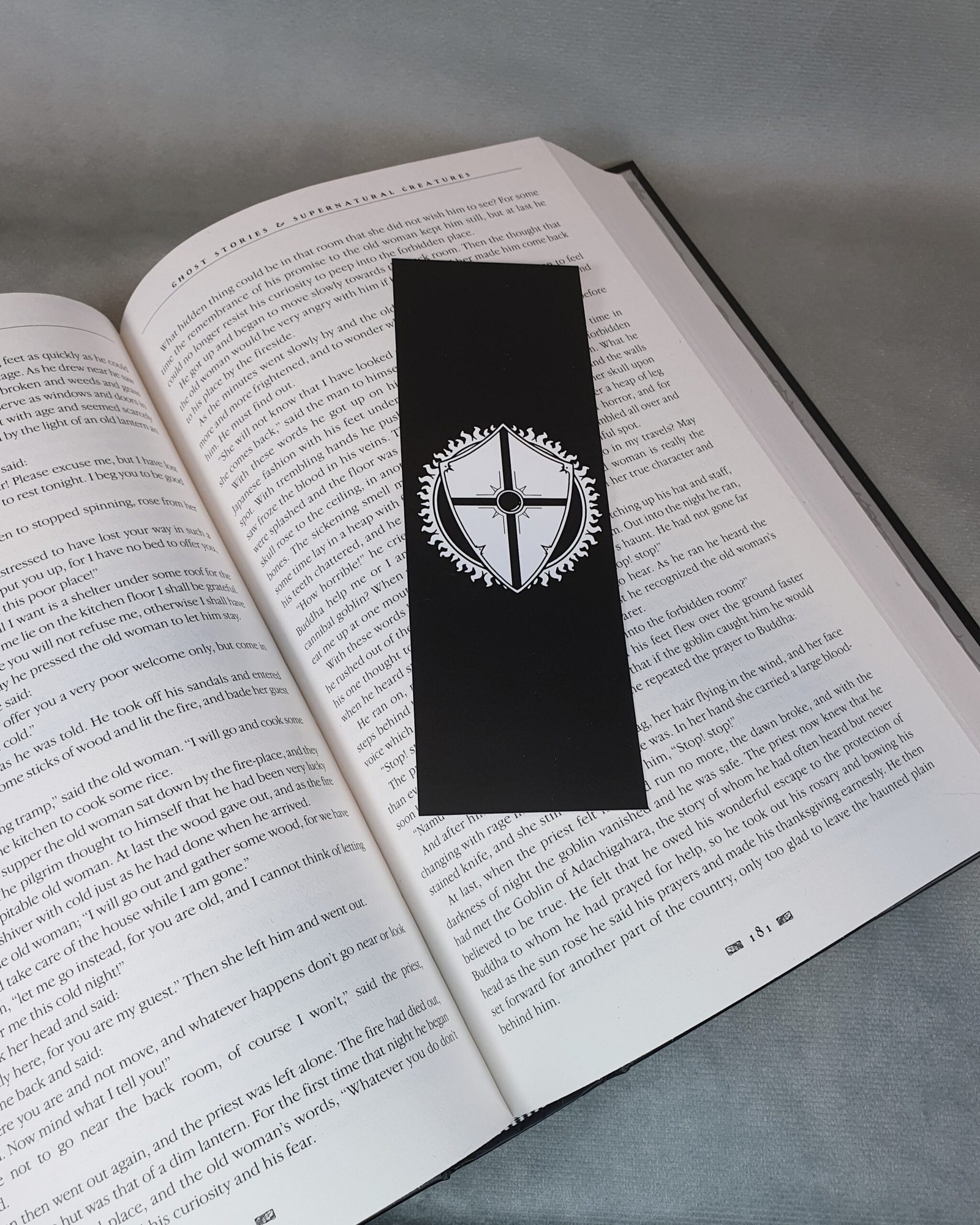 The symbol of the Order of Paladins on a bookmark featuring a short, offbeat humorous text on the back.