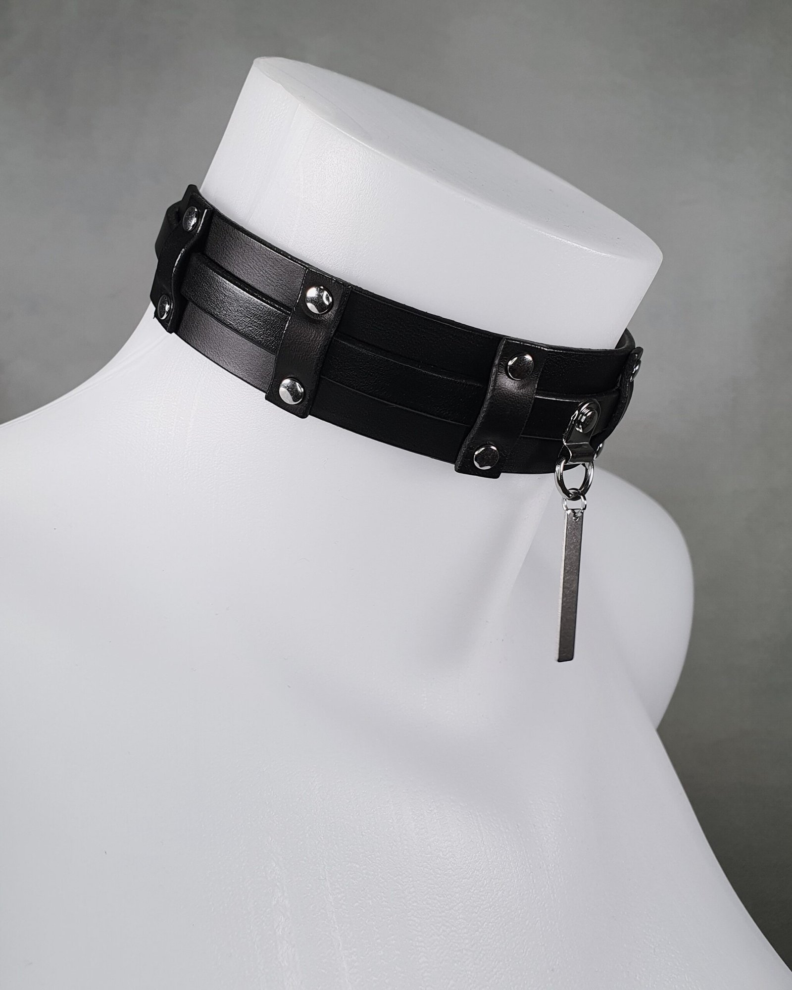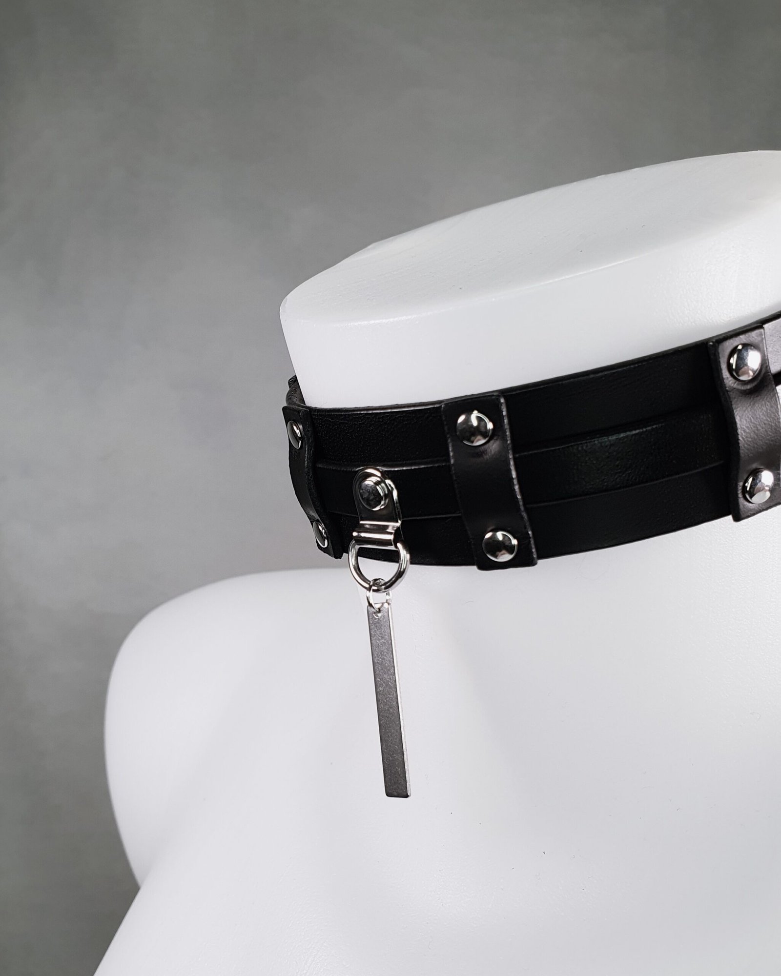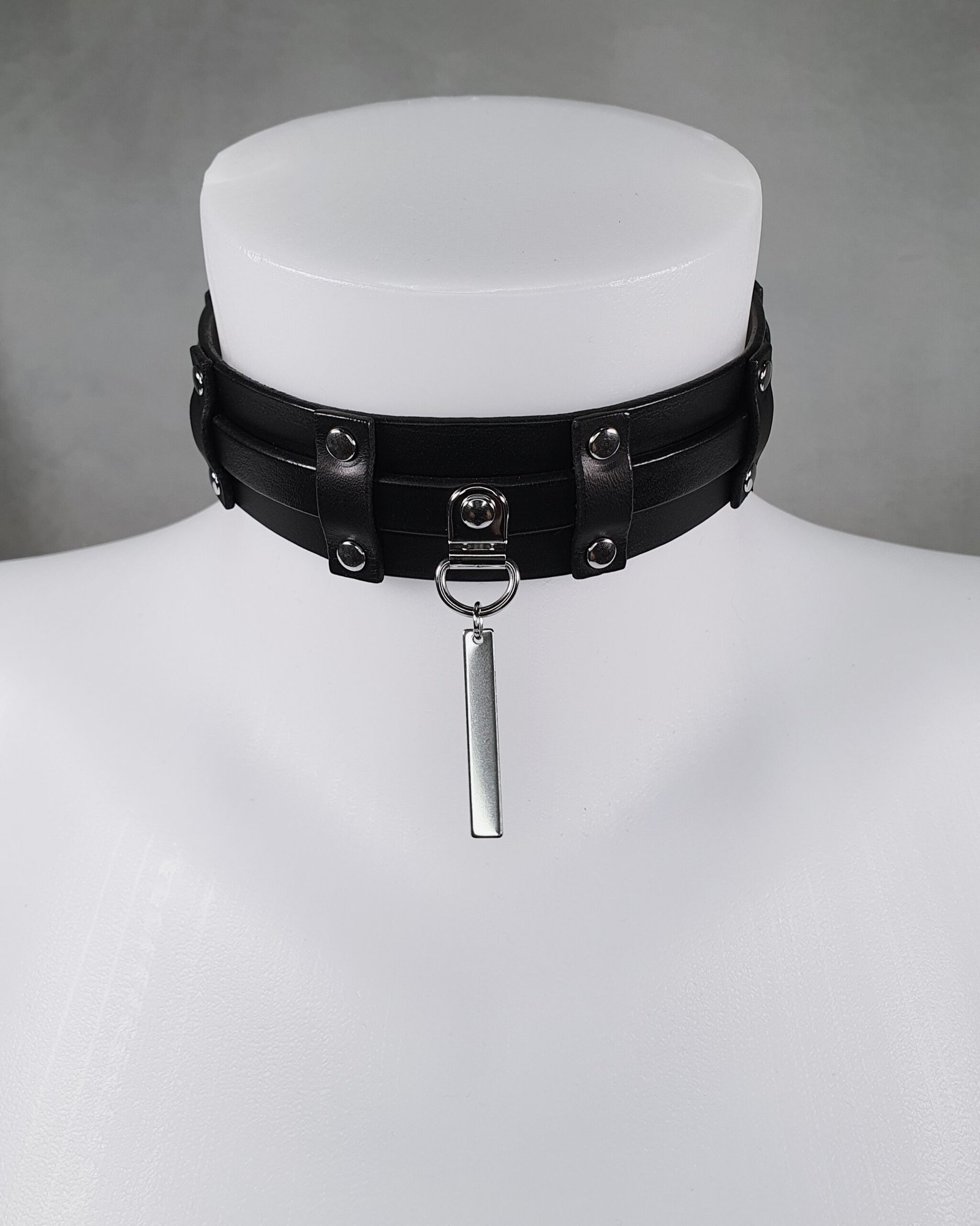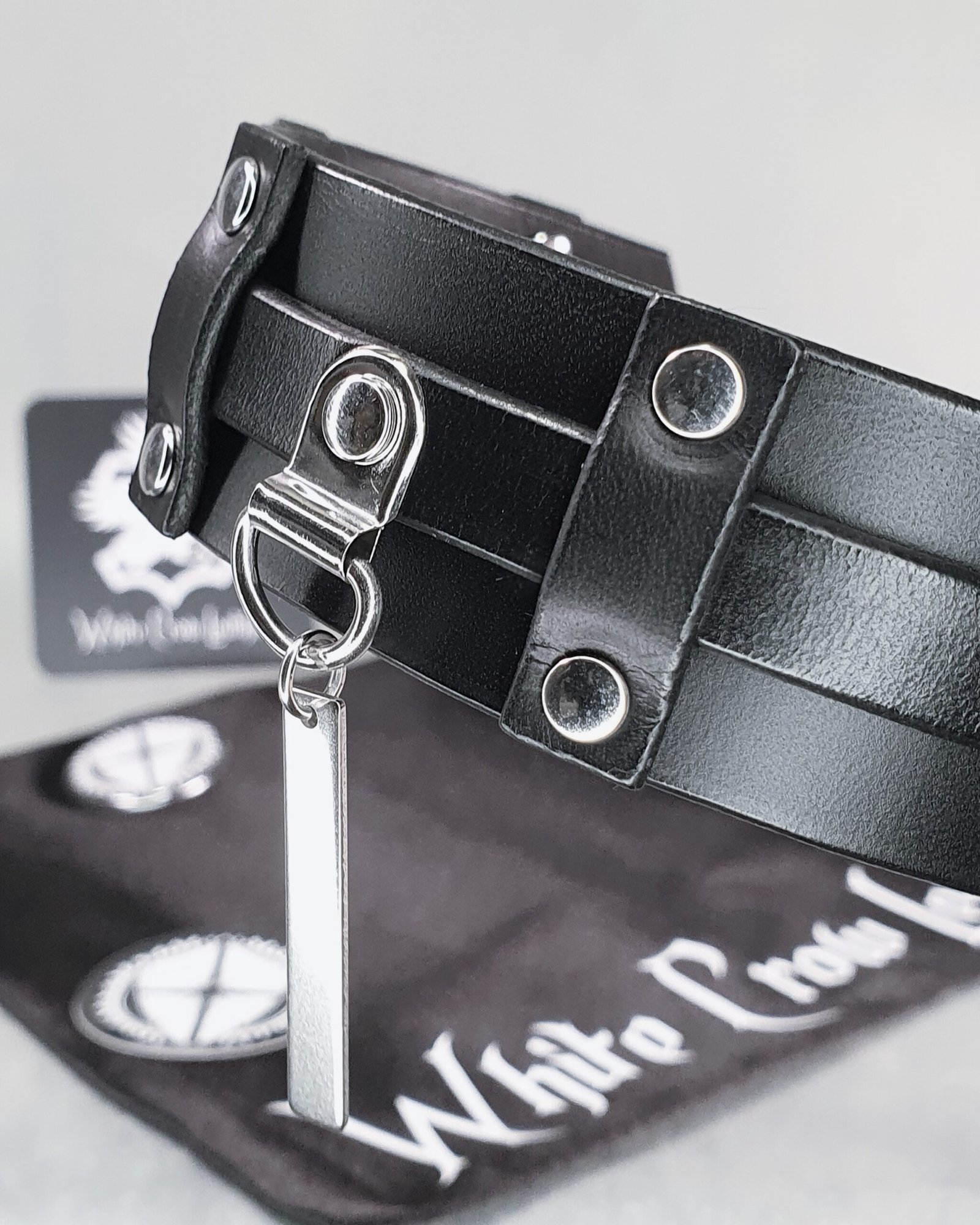 This 3cm wide choker, crafted from high-quality black genuine leather, features multiple riveted bands reminiscent of barding, symbolizing strength and resilience. A rectangular stainless steel charm at its center evokes the uprightness of paladins. A perfect accessory to embody bravery.