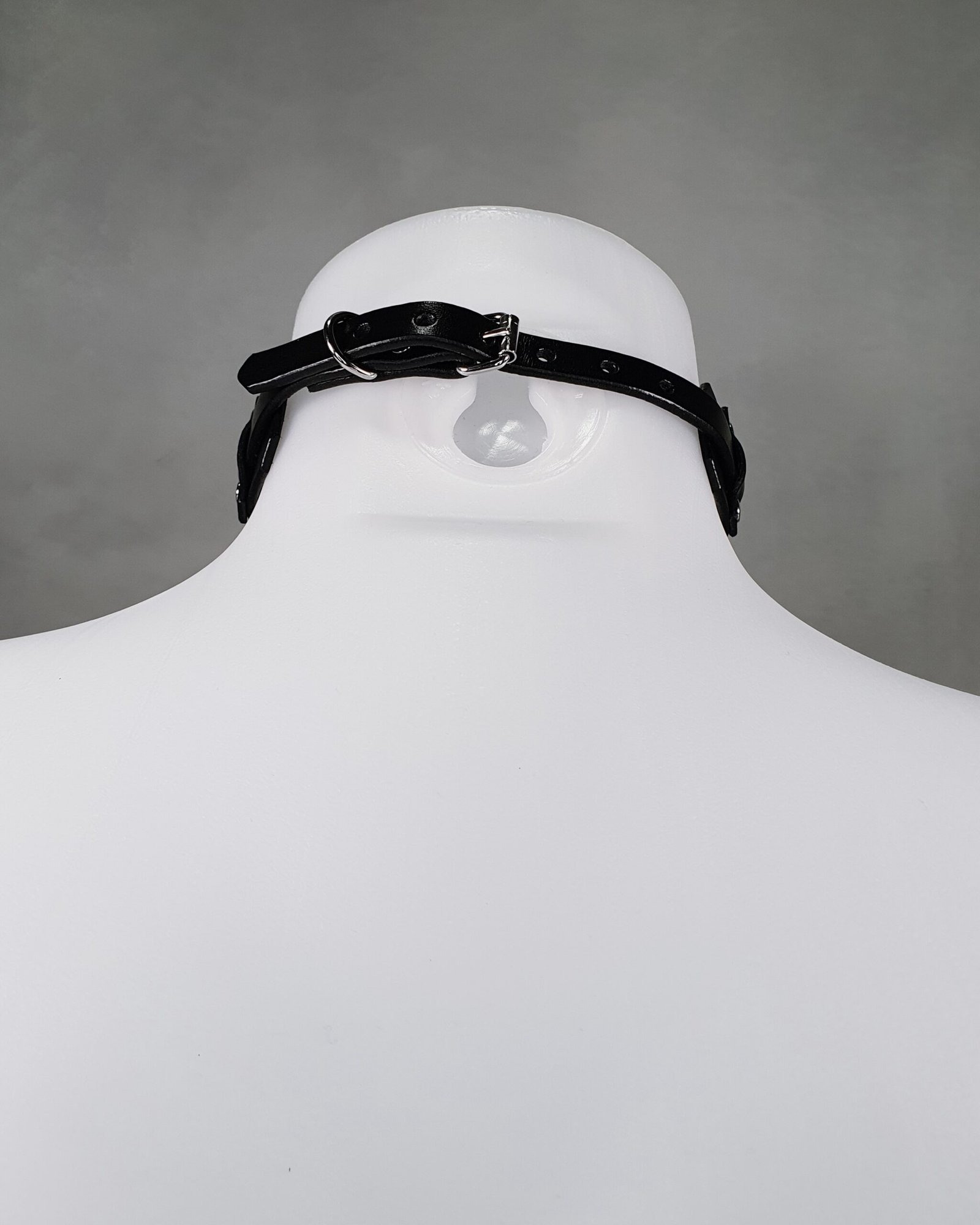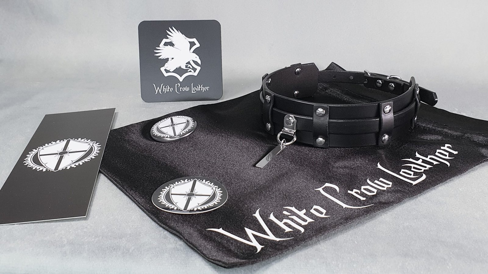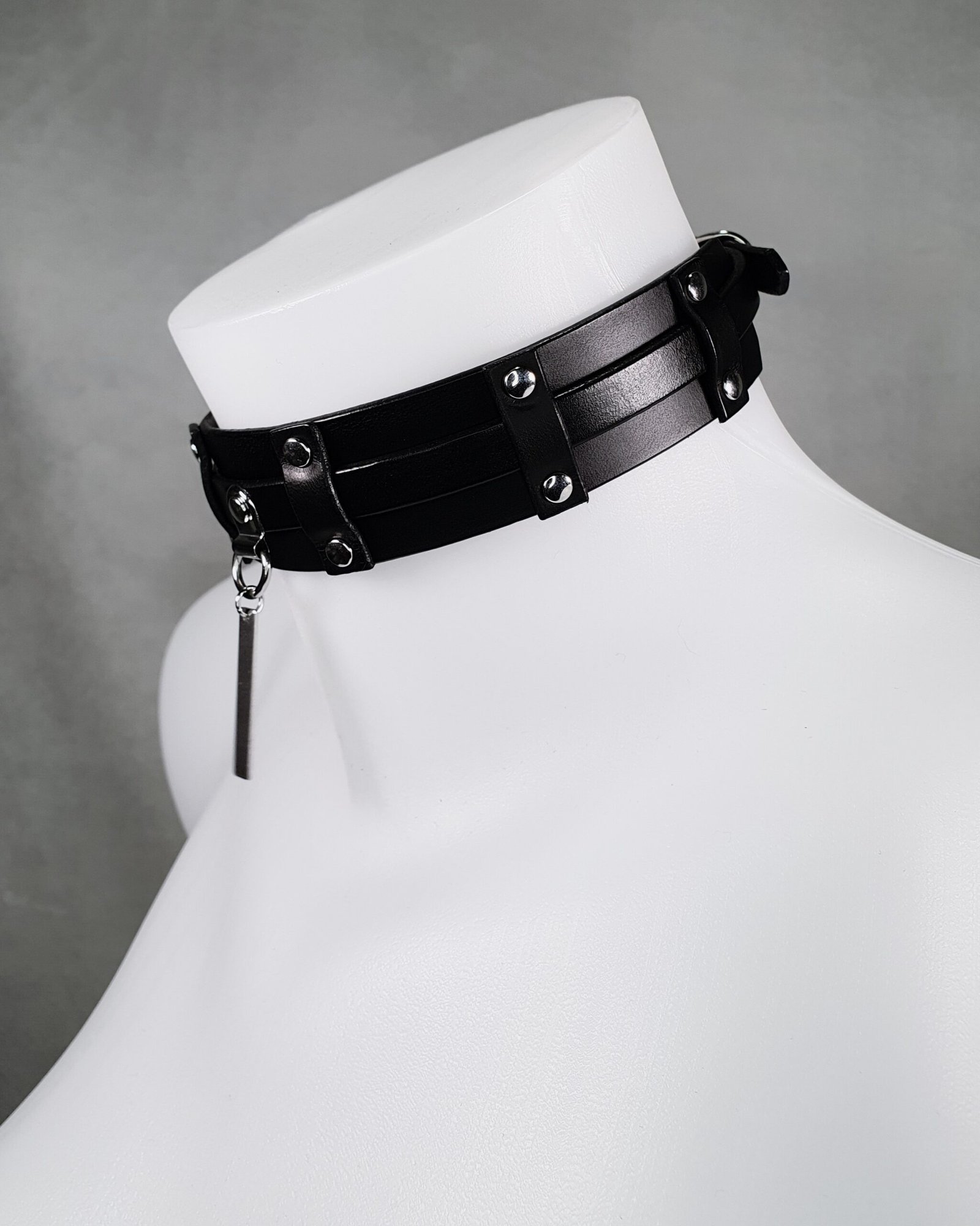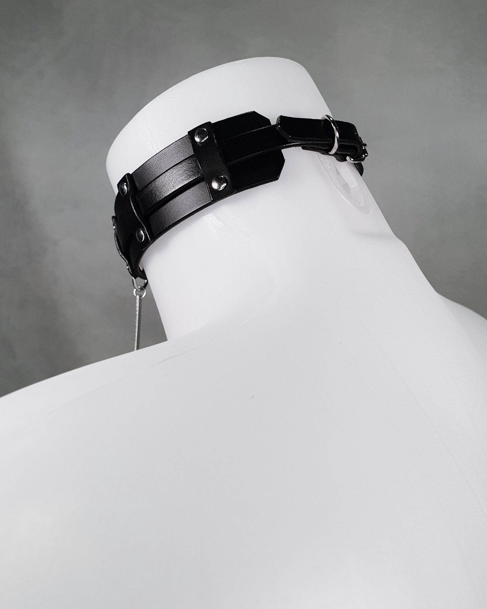 This 3cm wide choker, crafted from high-quality black genuine leather, features multiple riveted bands reminiscent of barding, symbolizing strength and resilience. A rectangular stainless steel charm at its center evokes the uprightness of paladins. A perfect accessory to embody bravery.