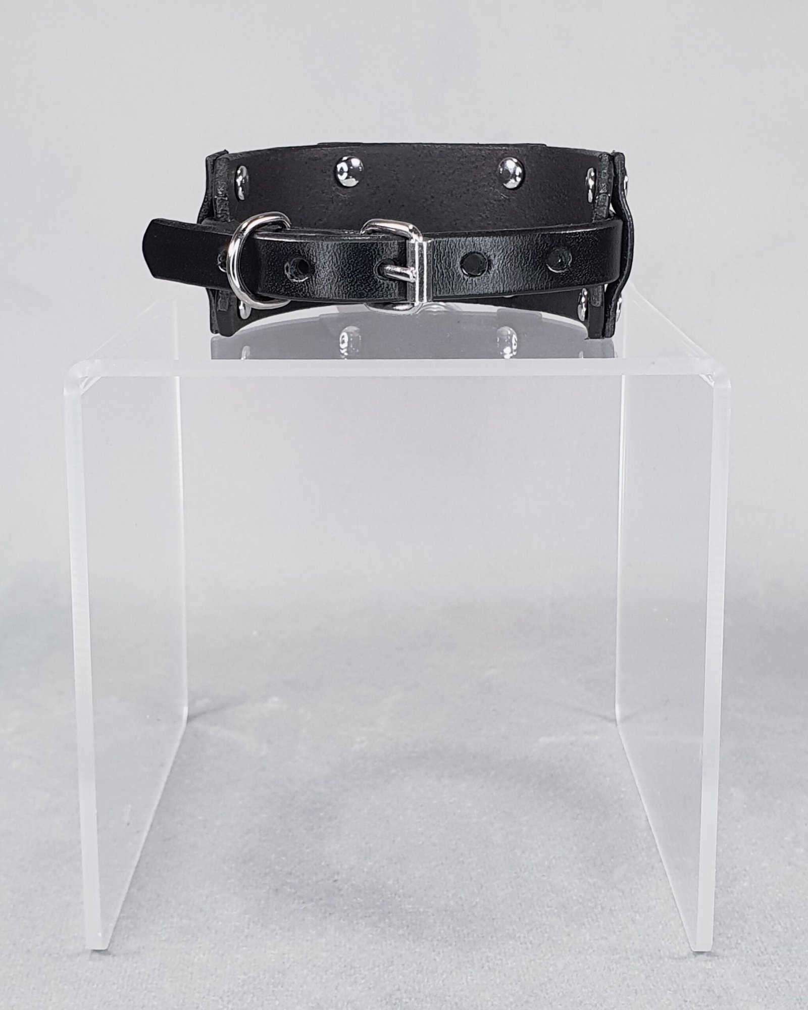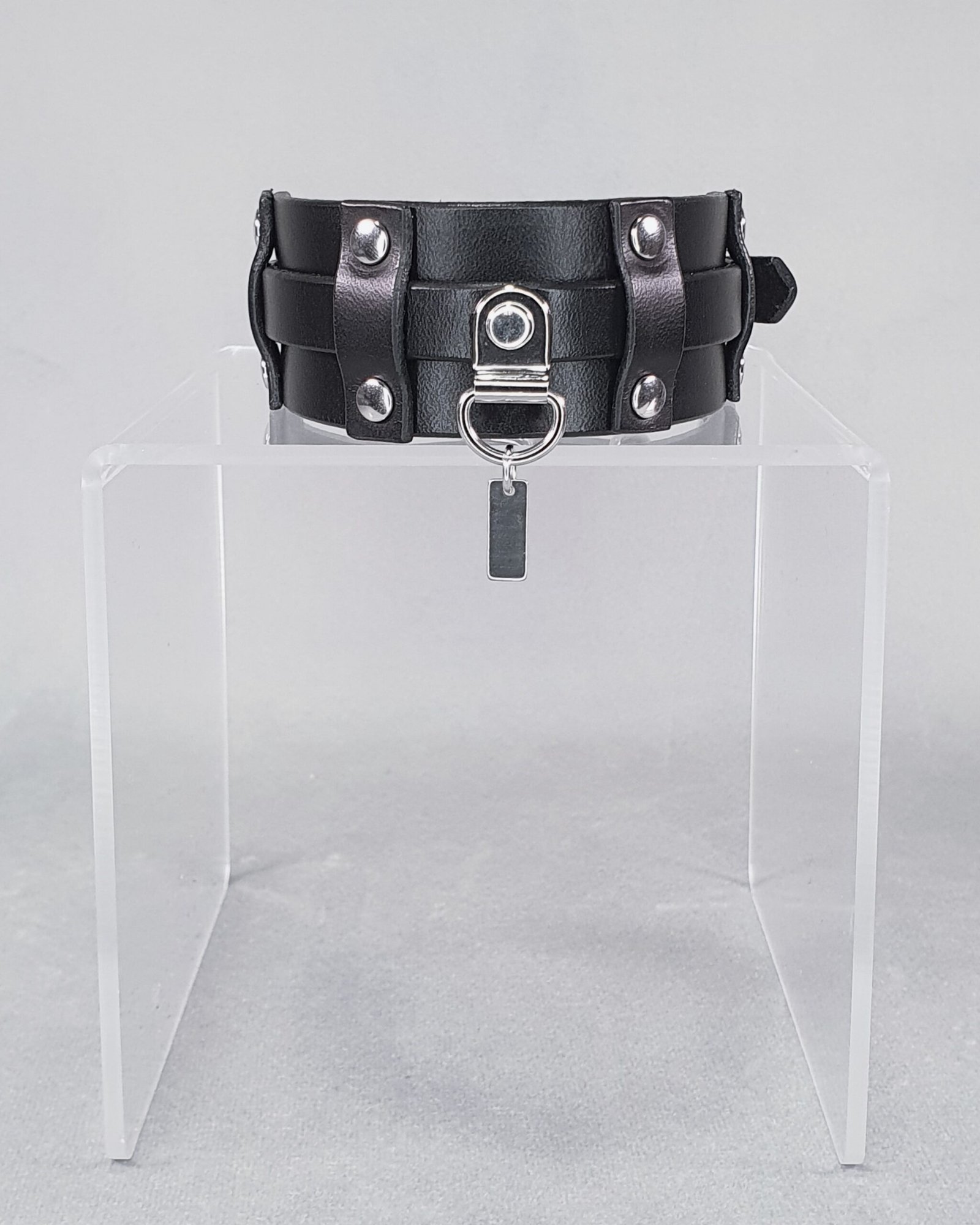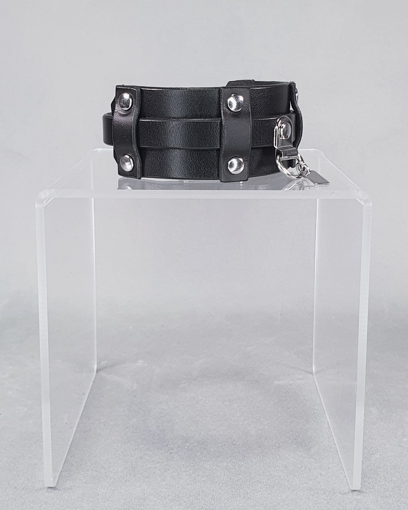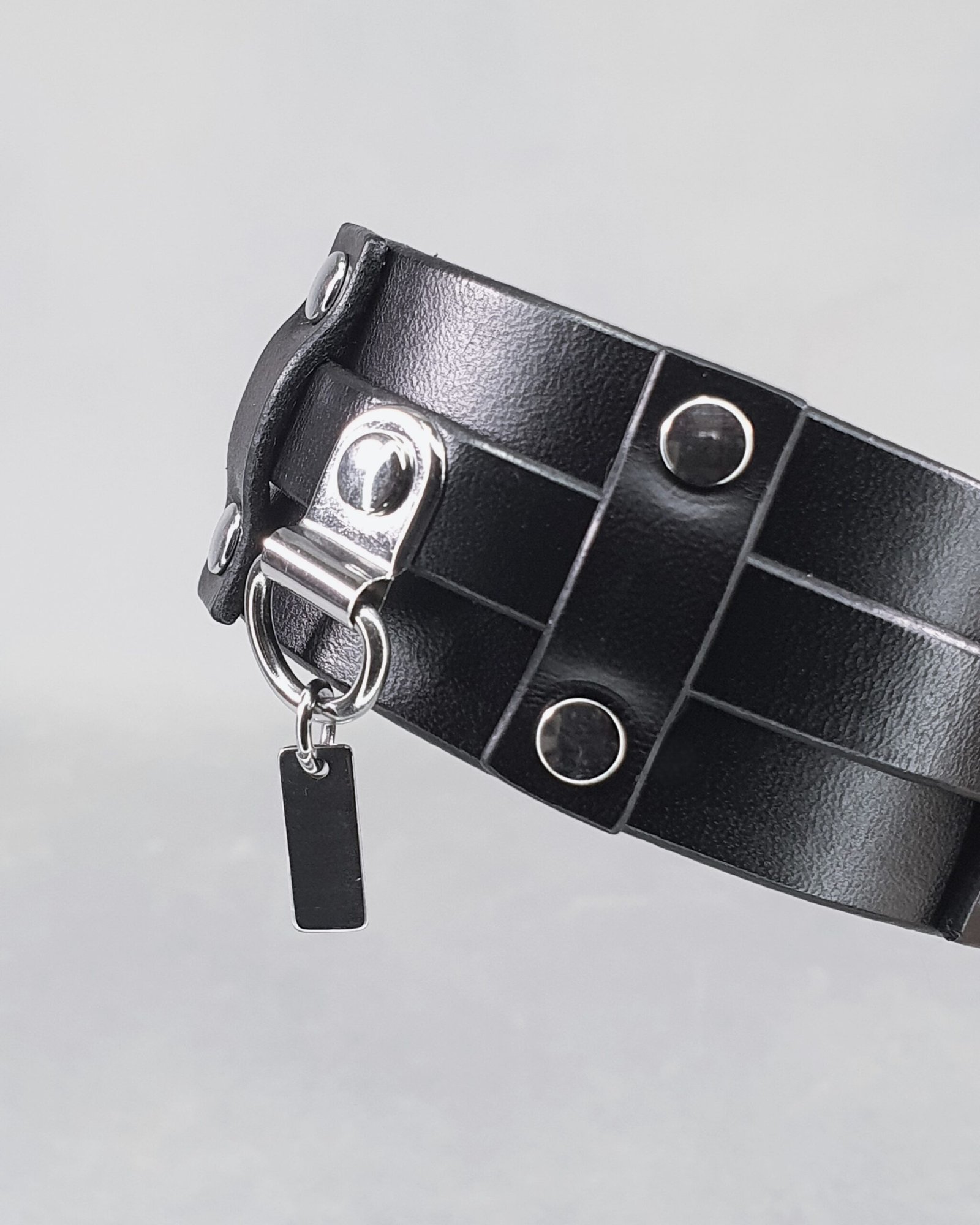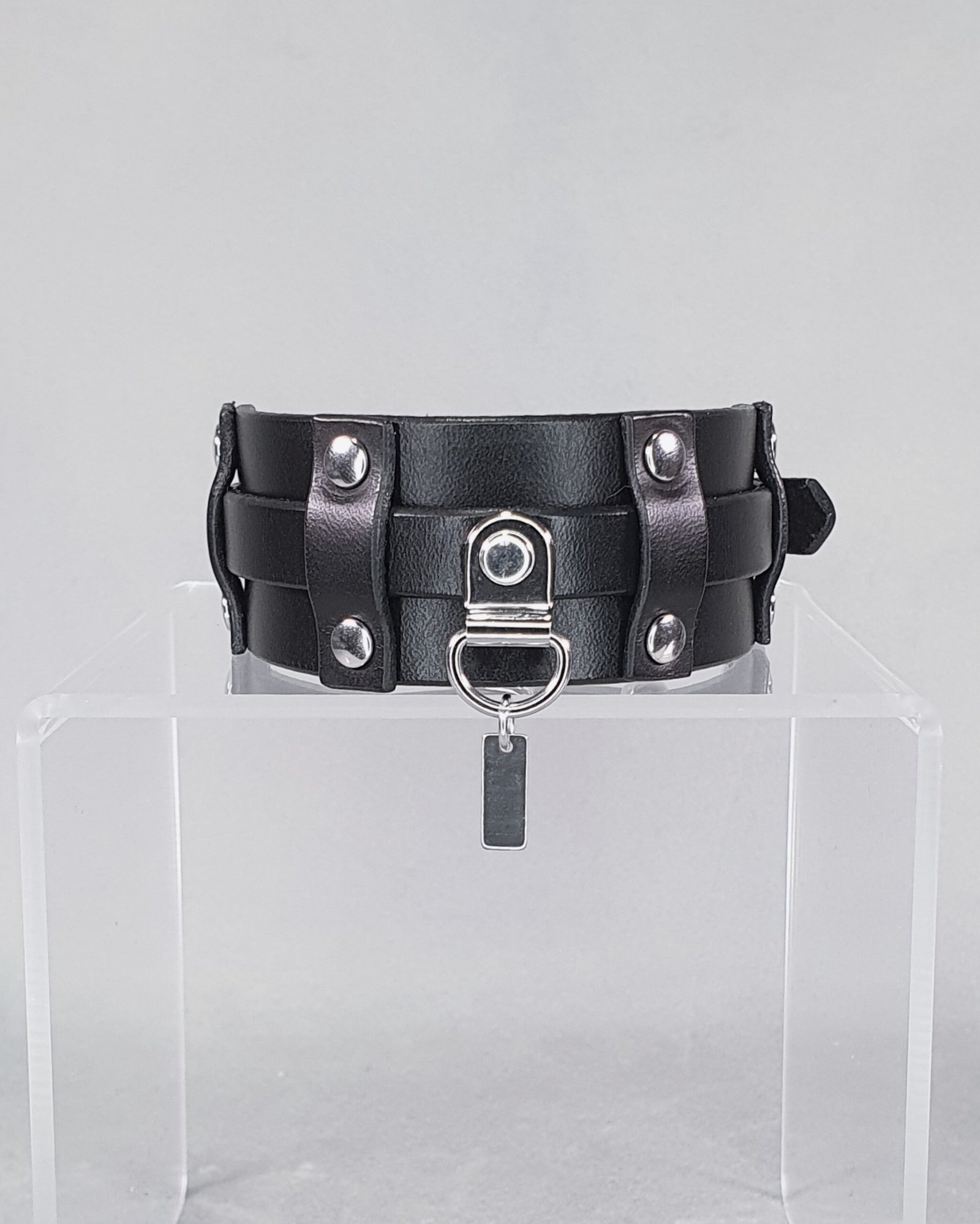 Show your determination with this cuff bracelet featuring a 3cm wide main band and four riveted vertical bands, beneath which runs a central band adorned with a small rectangular charm. Steel details enhance the rugged look of this black genuine leather accessory.