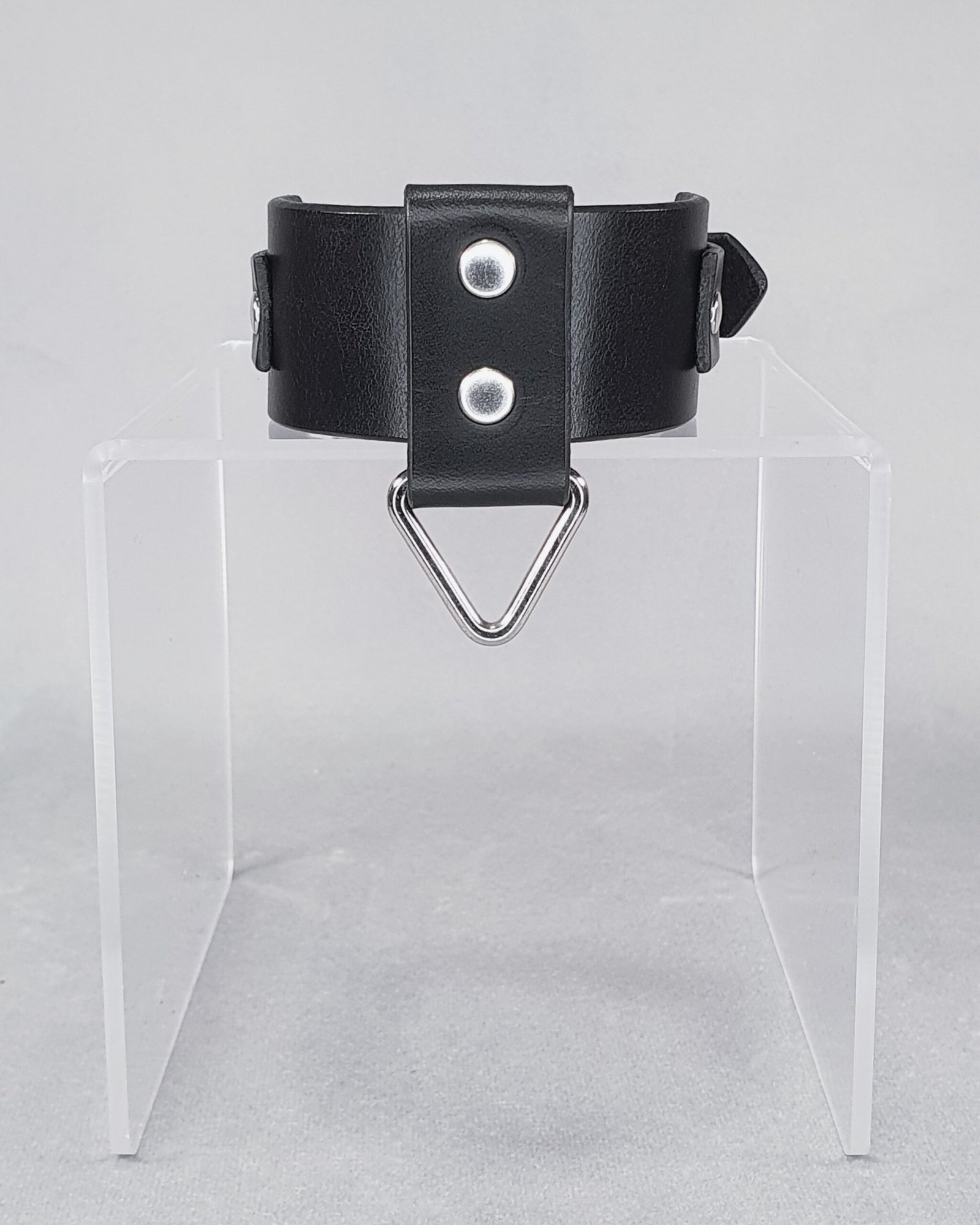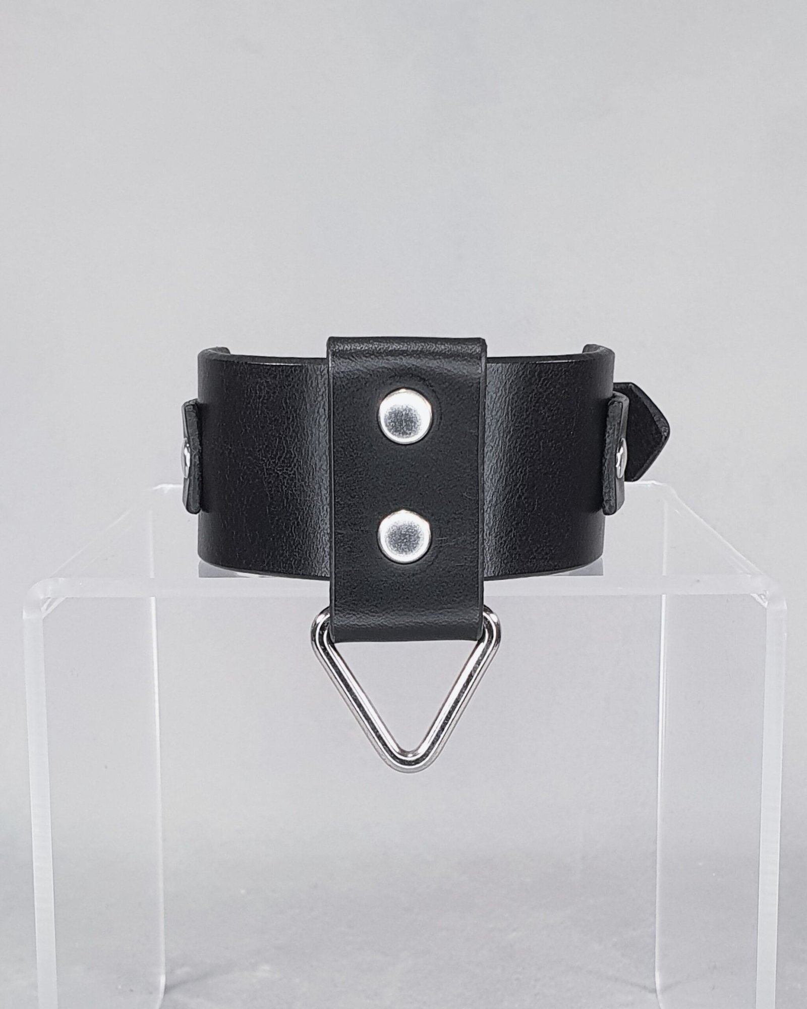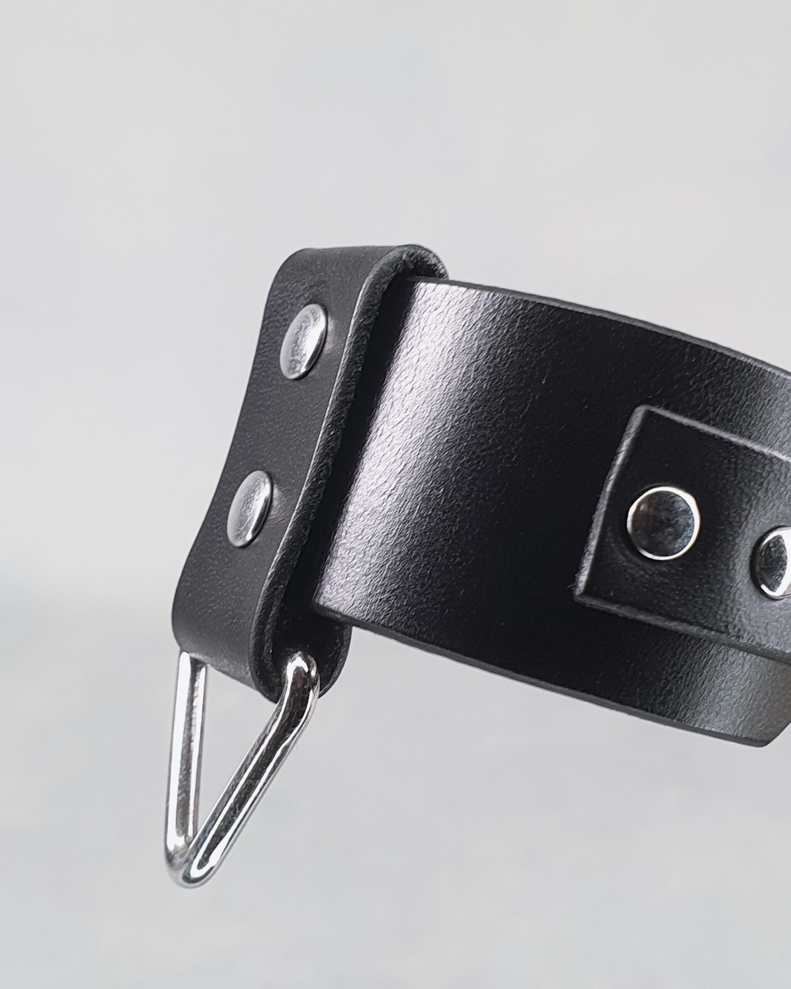 This premium genuine leather wristband boasts a modern and minimalist aesthetic, where polished steel details accentuate the velvety depth of the black leather. Adorned with a triangular loop and a wide, riveted vertical band, this accessory is designed to subtly enhance the wrist.