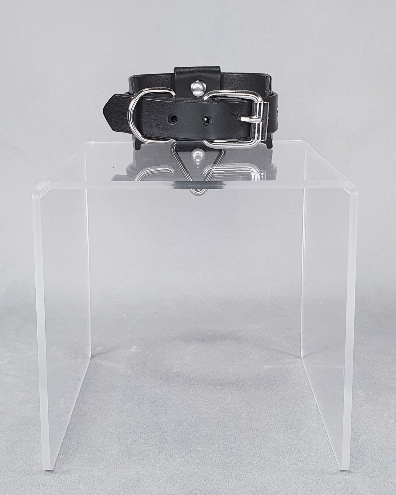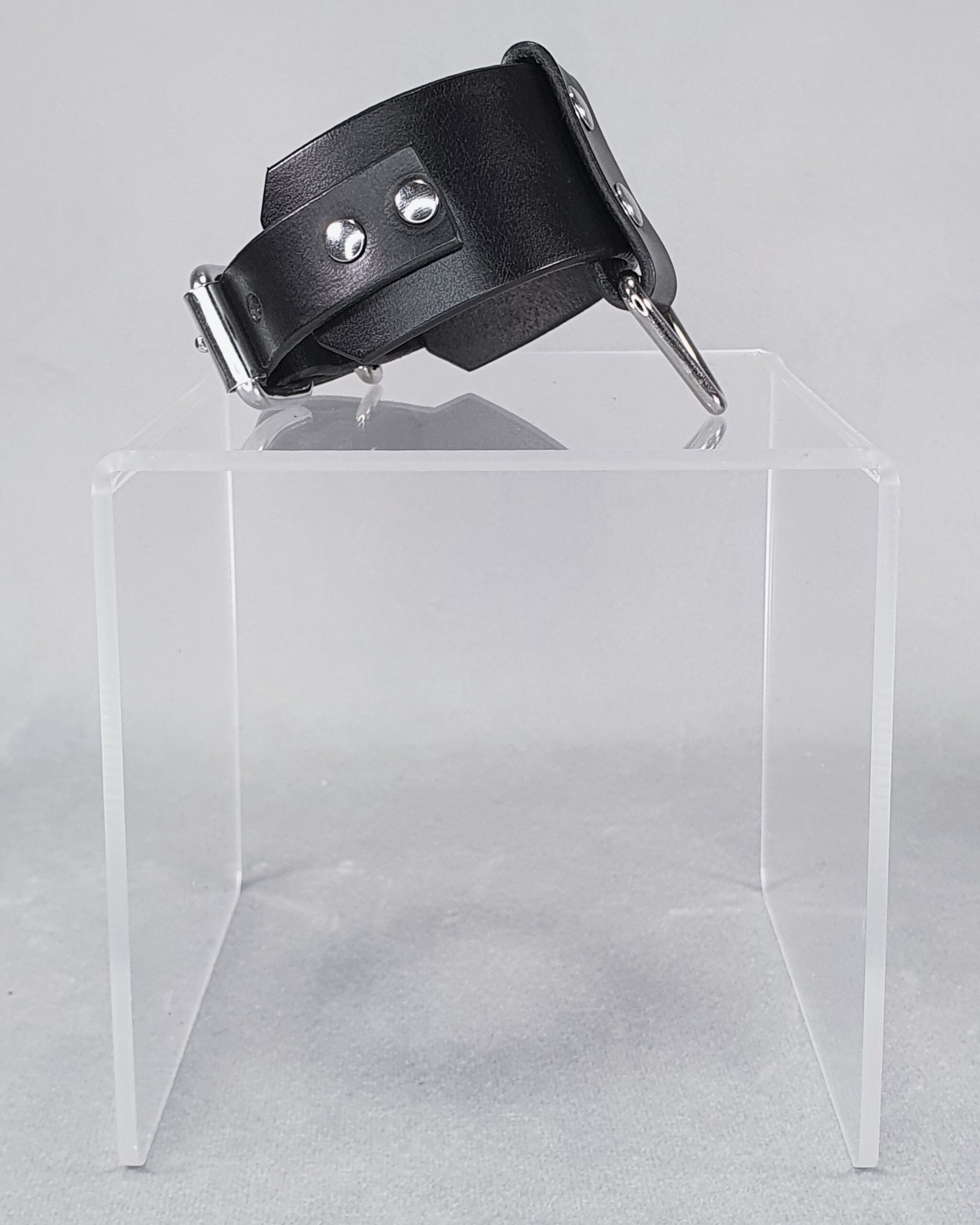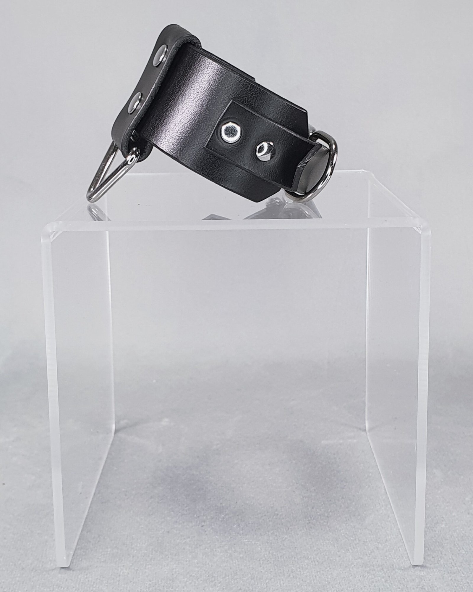 This premium genuine leather wristband boasts a modern and minimalist aesthetic, where polished steel details accentuate the velvety depth of the black leather. Adorned with a triangular loop and a wide, riveted vertical band, this accessory is designed to subtly enhance the wrist.
