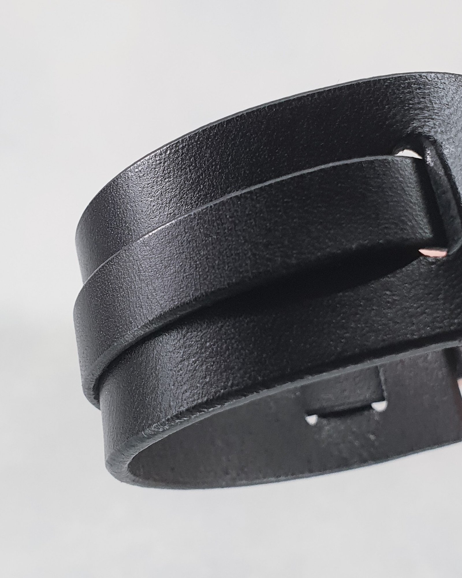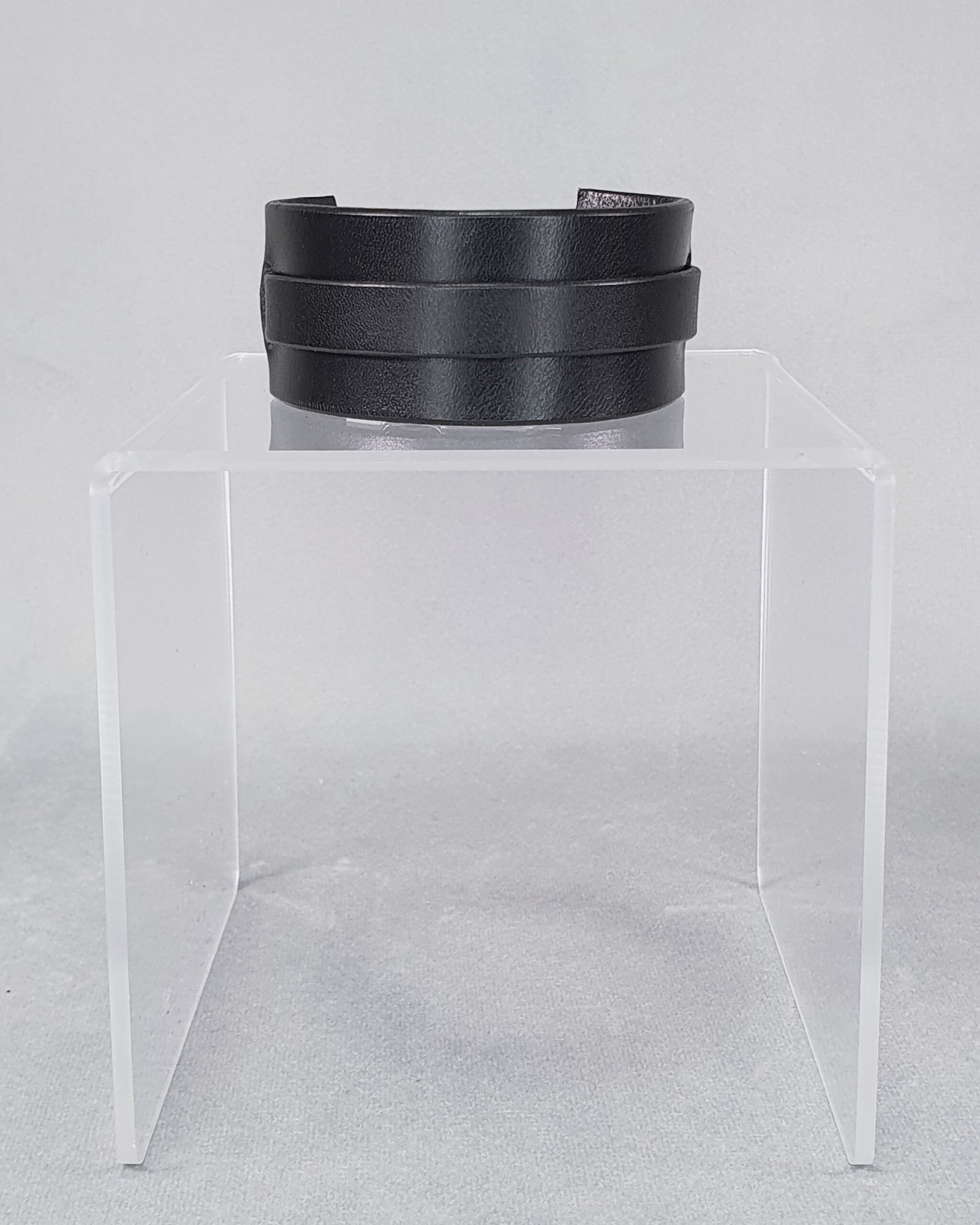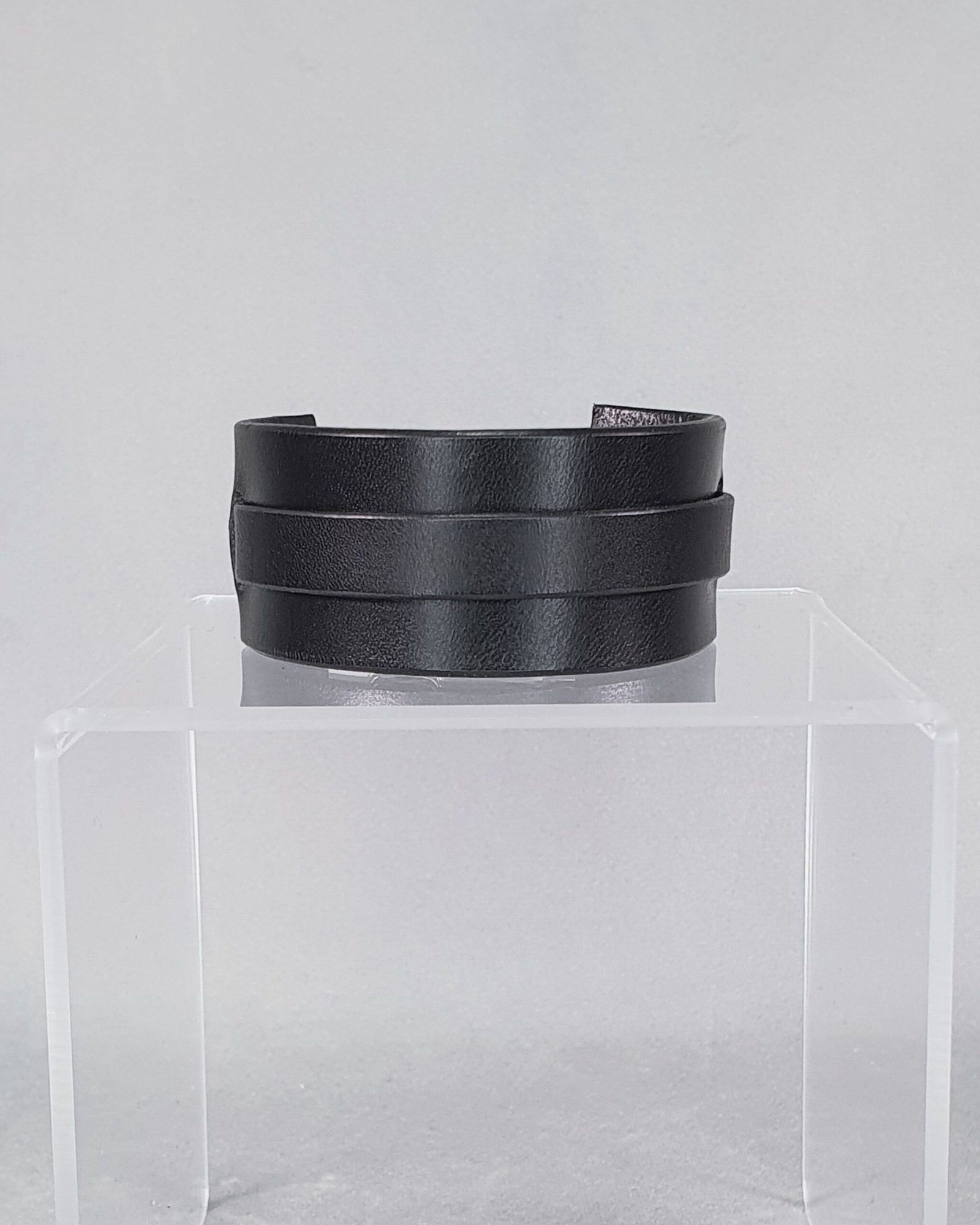 The simple yet powerful lines of this double-band black leather bracelet are designed to accentuate the wrist with understated elegance. A demure but stylish piece of jewelry.