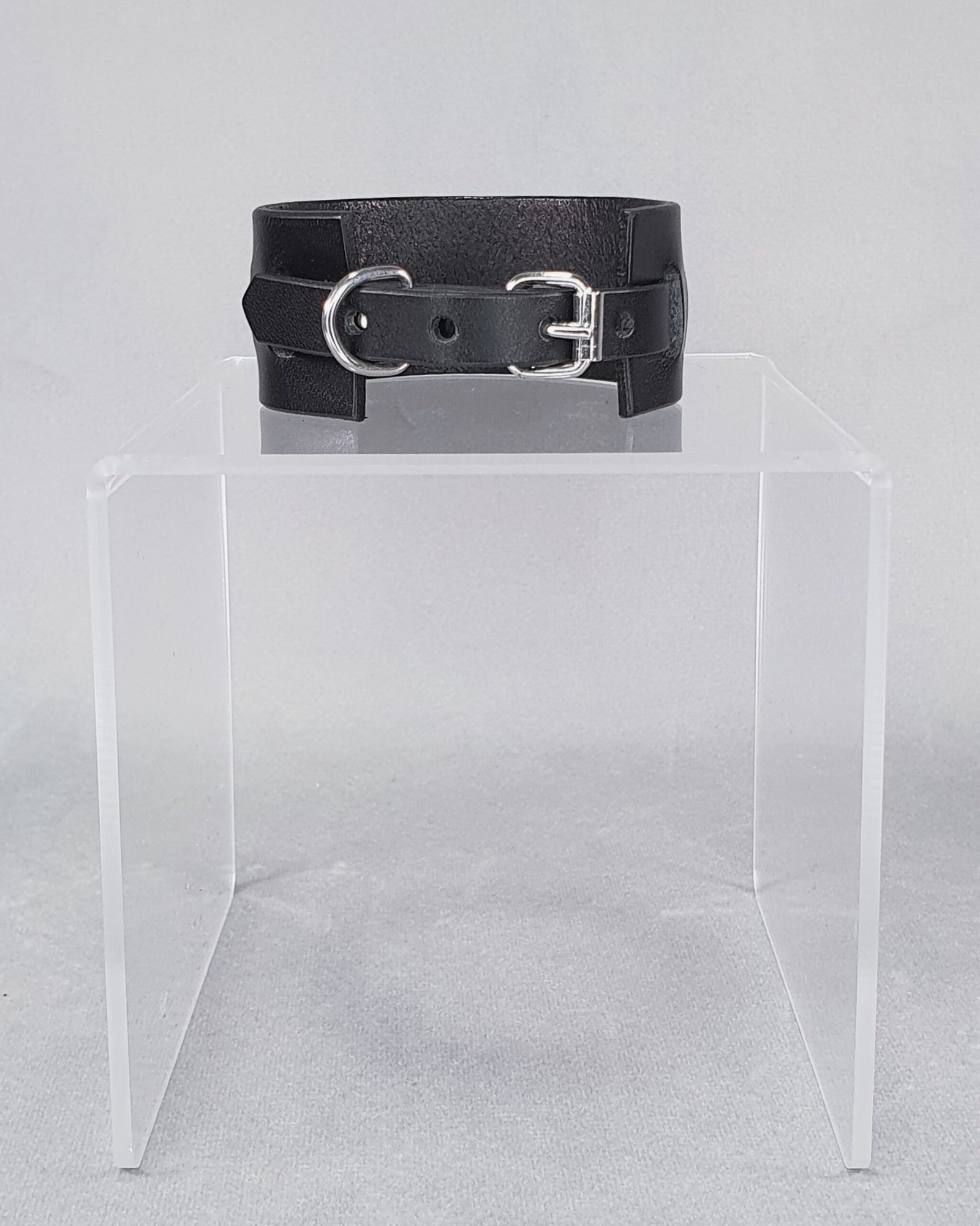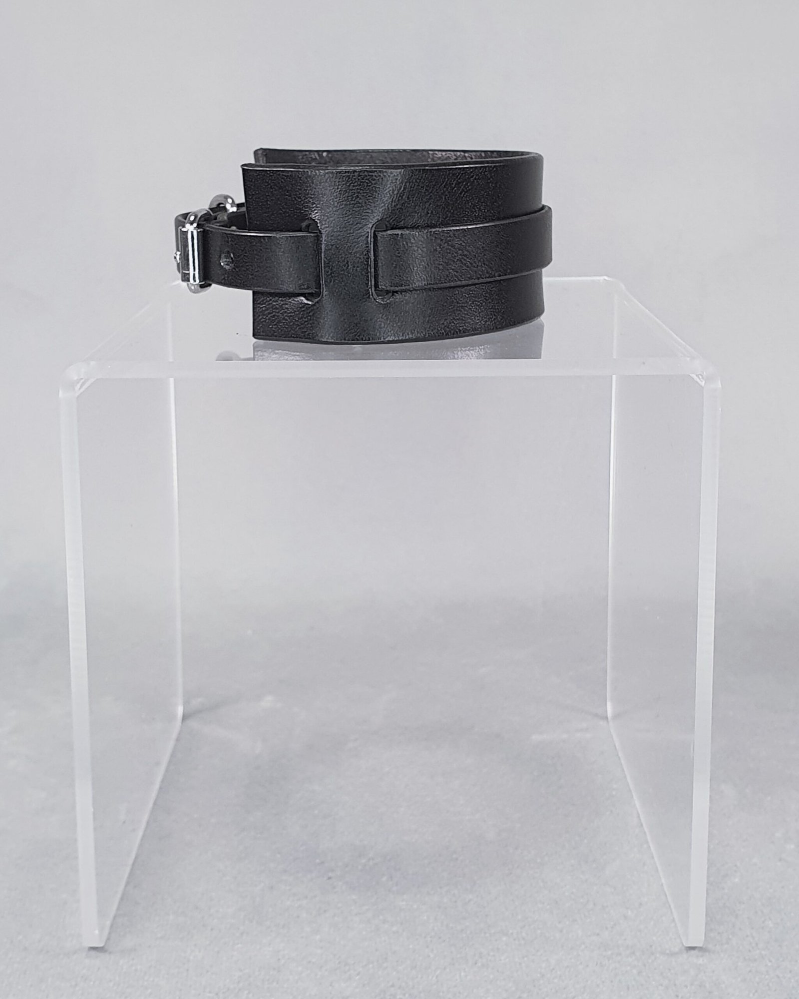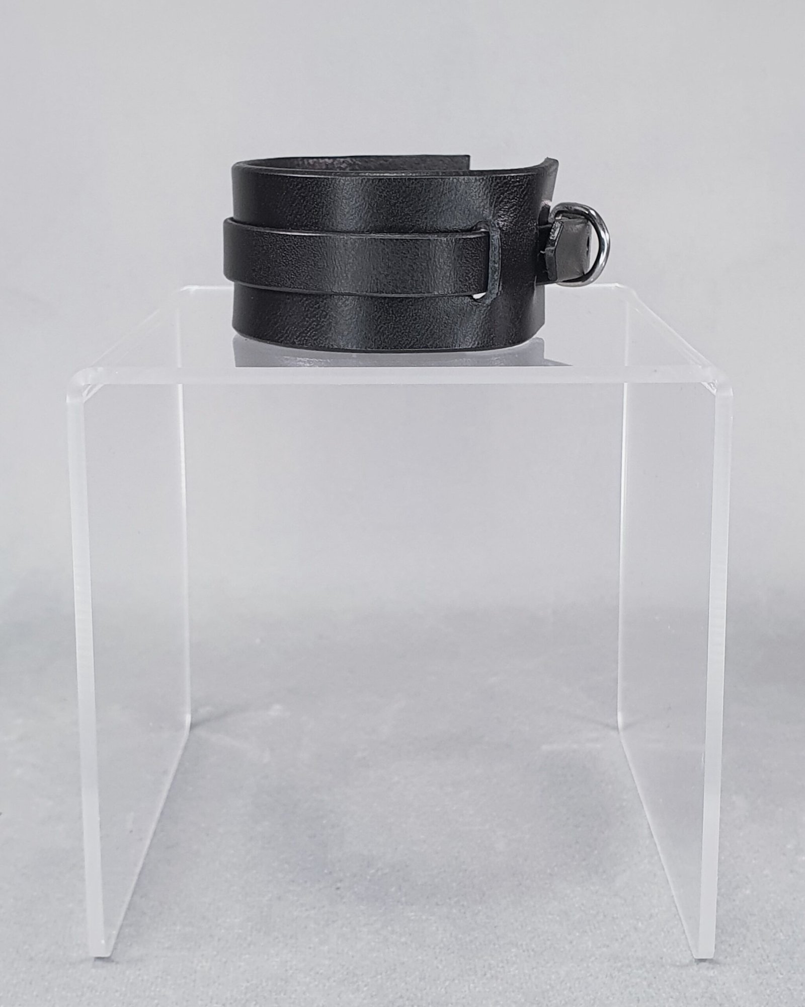 The simple yet powerful lines of this double-band black leather bracelet are designed to accentuate the wrist with understated elegance. A demure but stylish piece of jewelry.