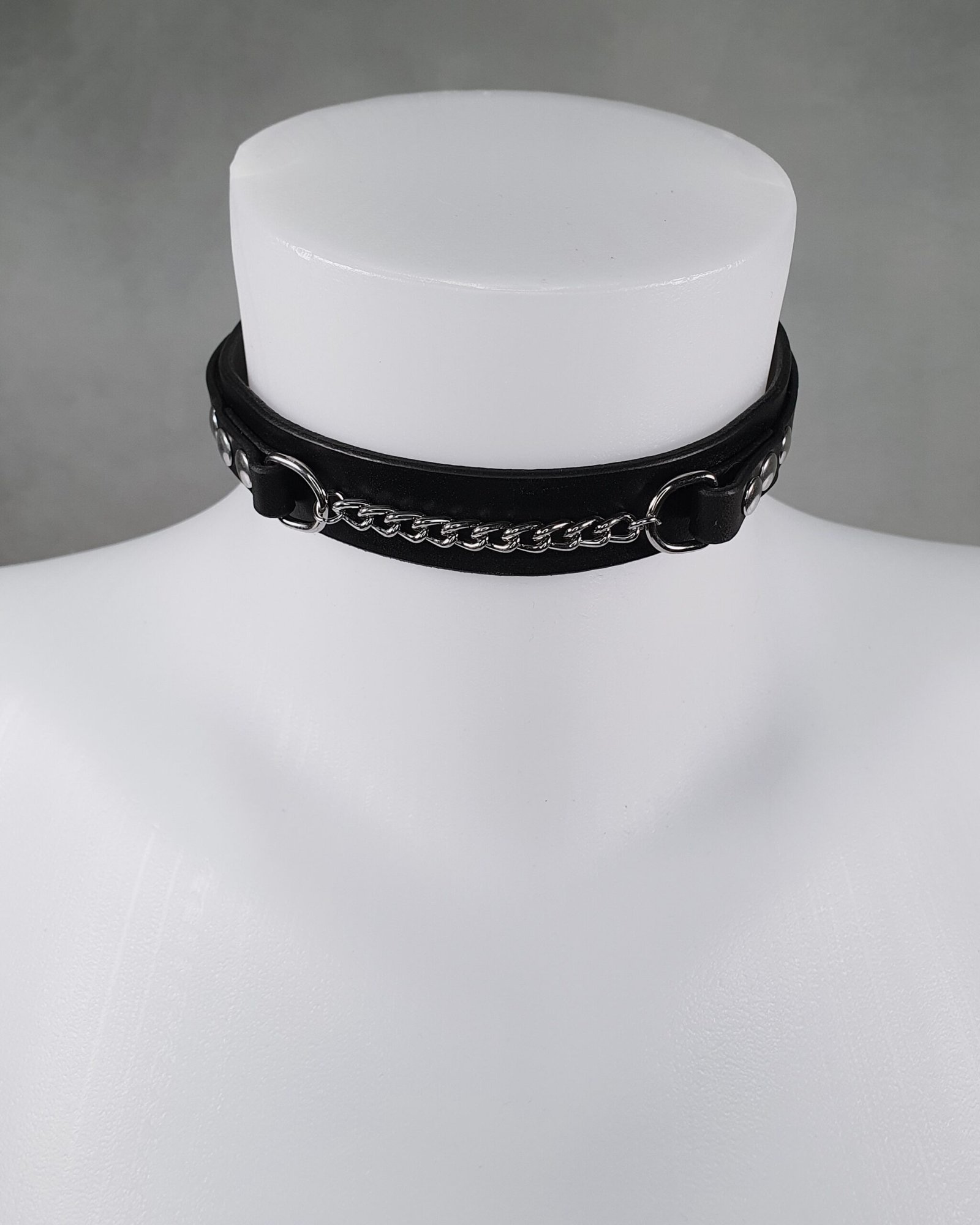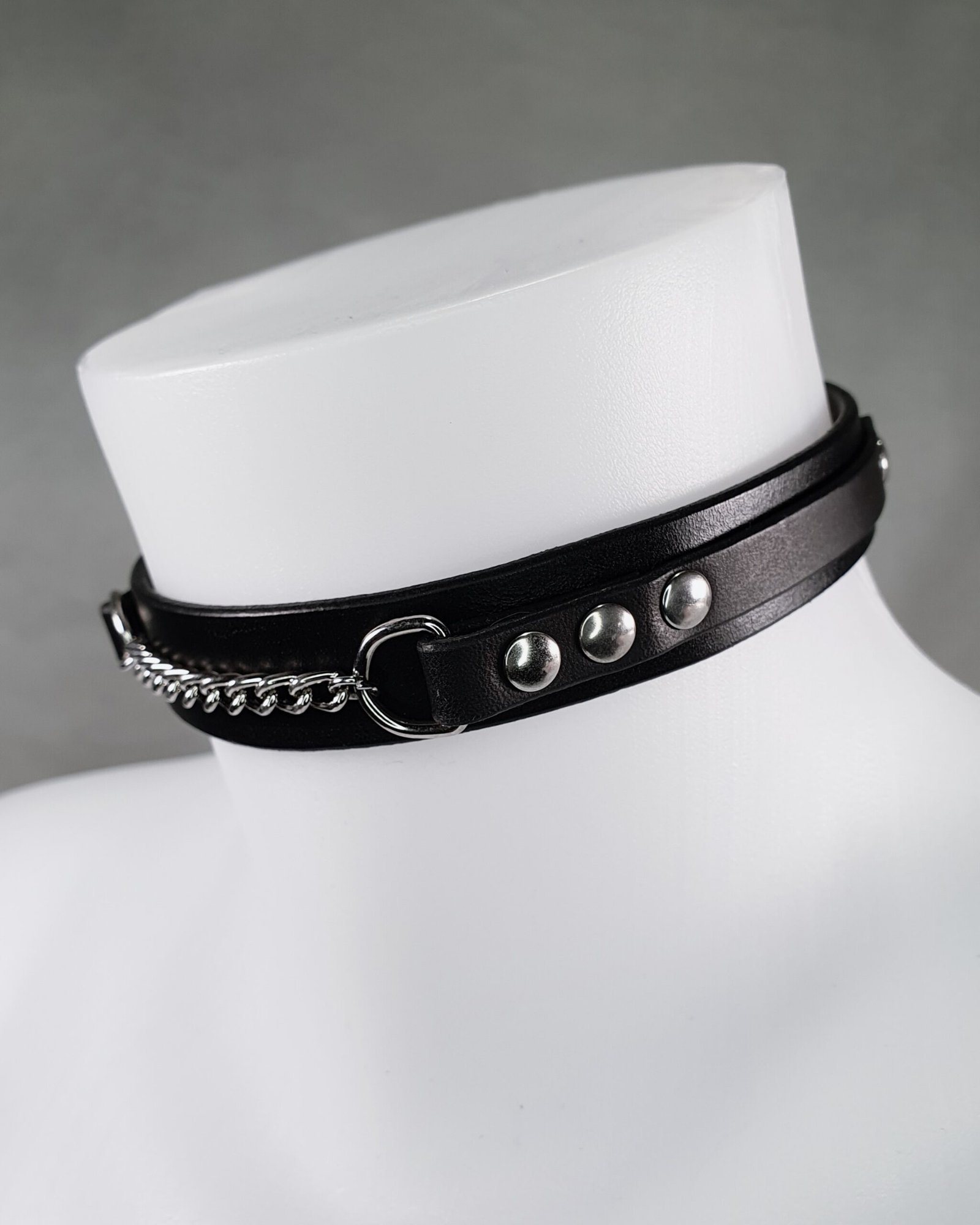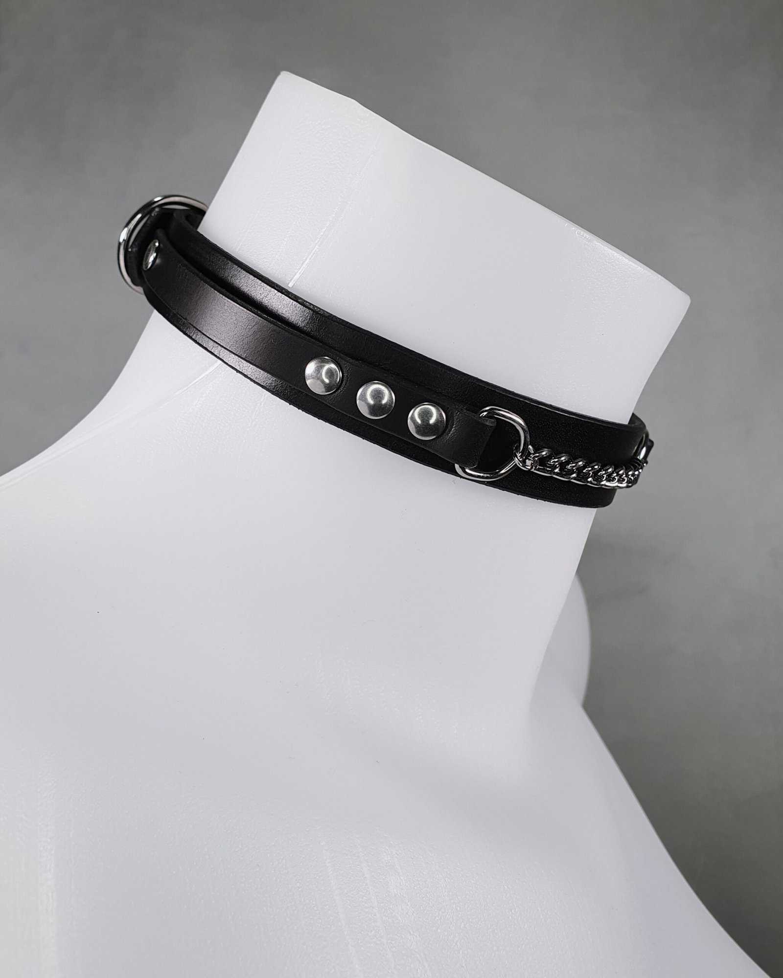 Break the mold with this double-banded, genuine black leather choker, adorned with D-rings and a chunky chain. A must-have accessory for urban warriors who face challenges with temerity.