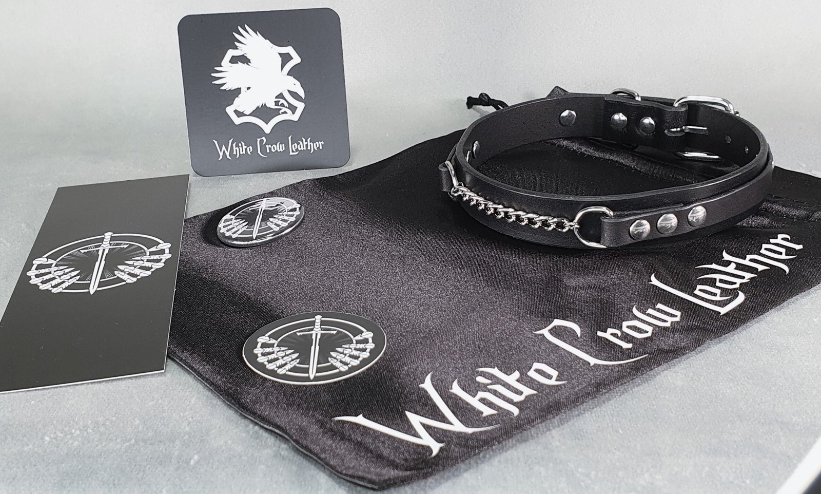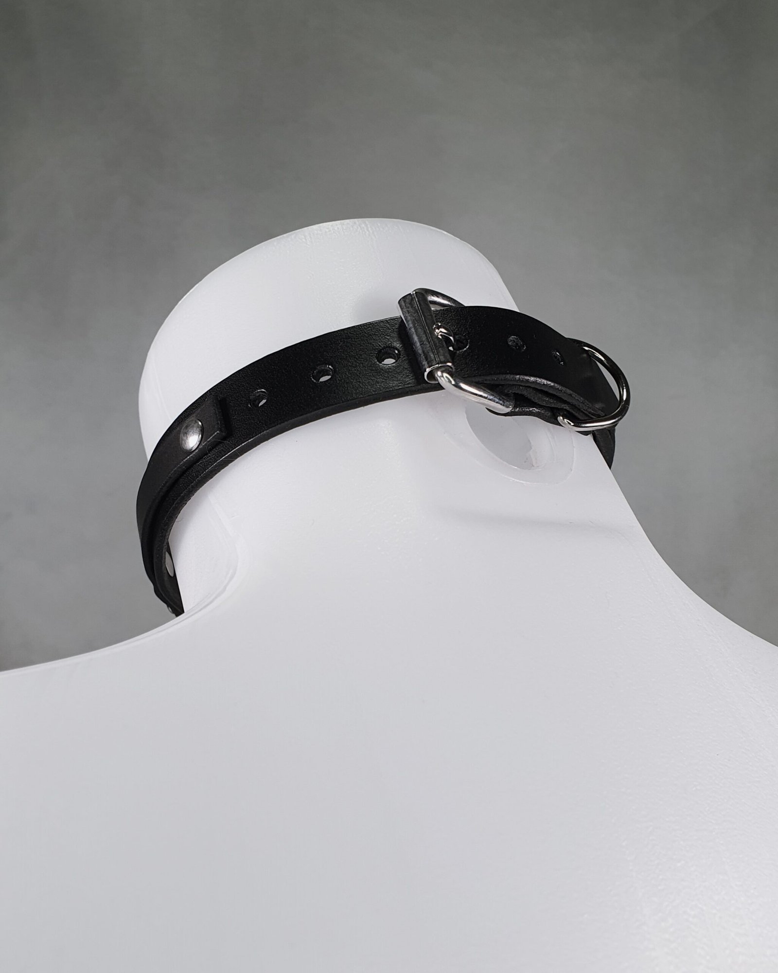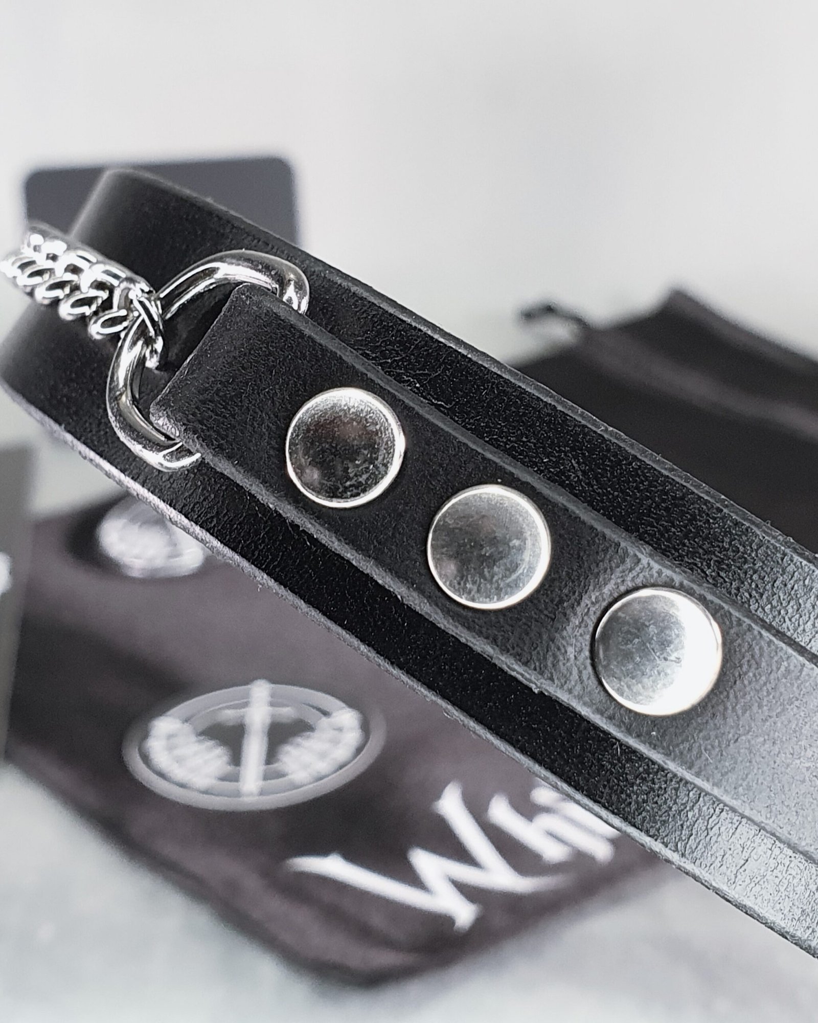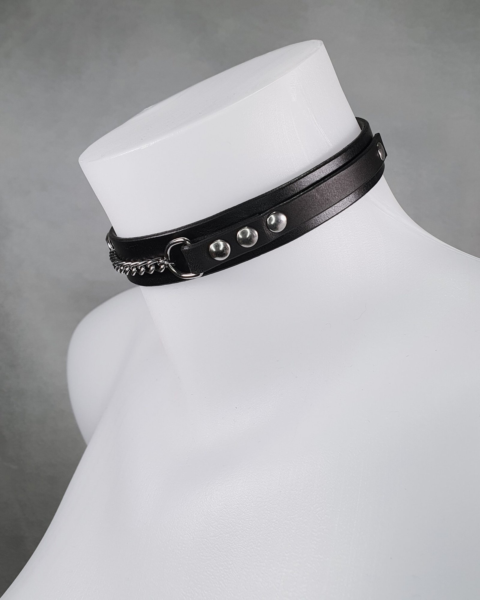 Break the mold with this double-banded, genuine black leather choker, adorned with D-rings and a chunky chain. A must-have accessory for urban warriors who face challenges with temerity.