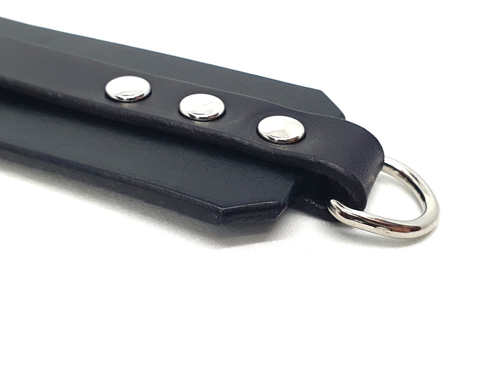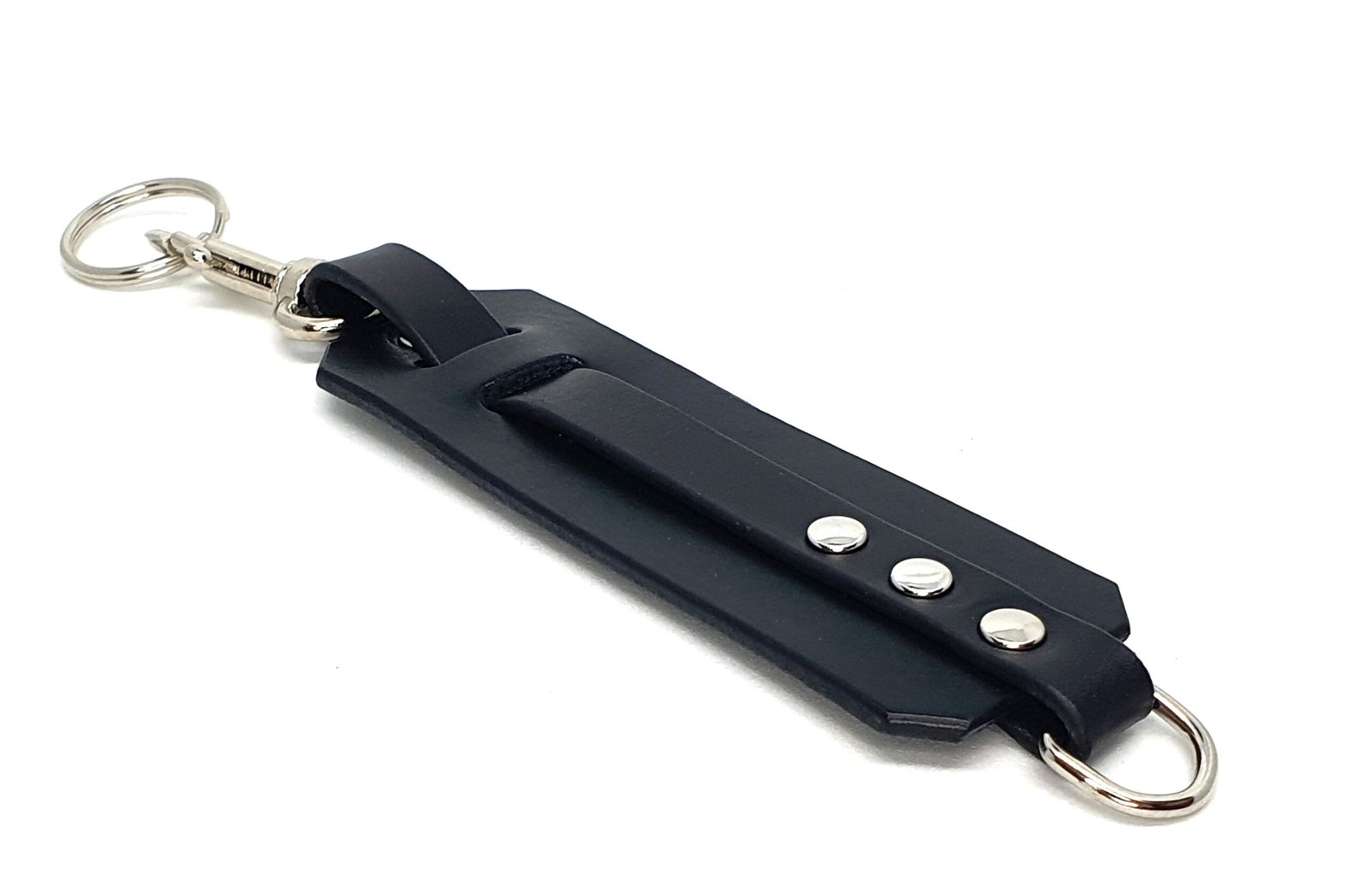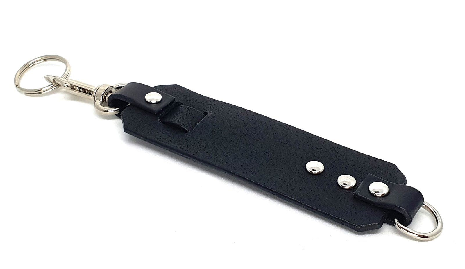 This genuine black leather keychain, adorned with rivets and a D-ring, is the perfect accessory to complete an uncompromising style. A symbol of bravery to attach to a bag or keychain.